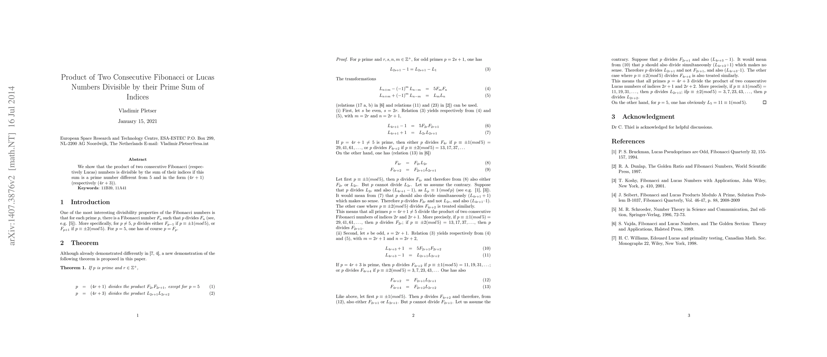 The product of two consecutive Fibonacci numbers is divisible by the sum of their indices if that sum is a prime number, specifically for primes in the forms (4r+1) or (4r+3).