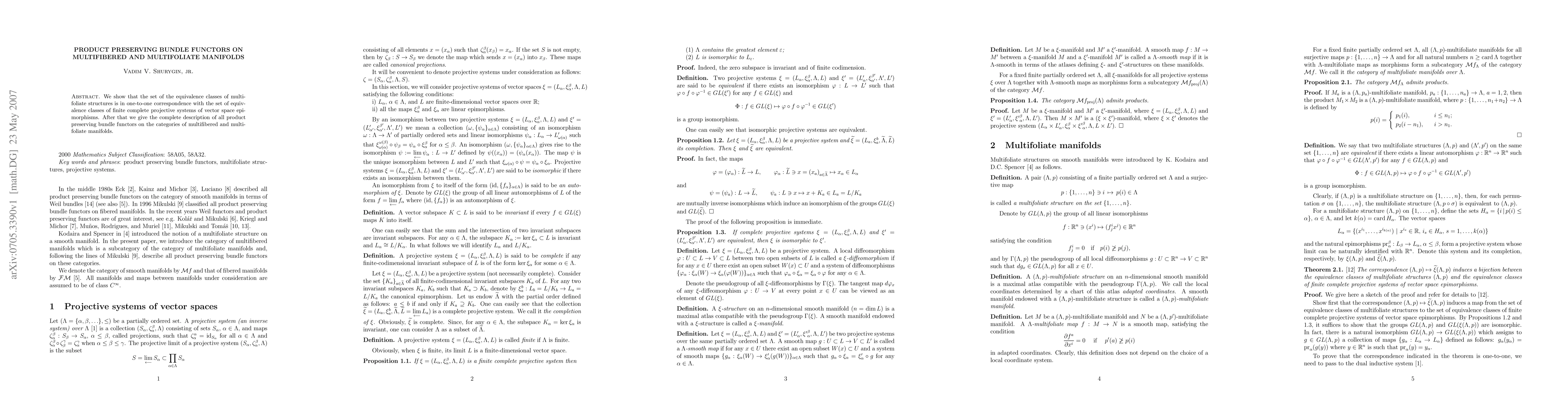 The paper introduces a detailed classification of product preserving bundle functors on multifibered and multifoliate manifolds using finite complete projective systems of vector space epimorphisms.