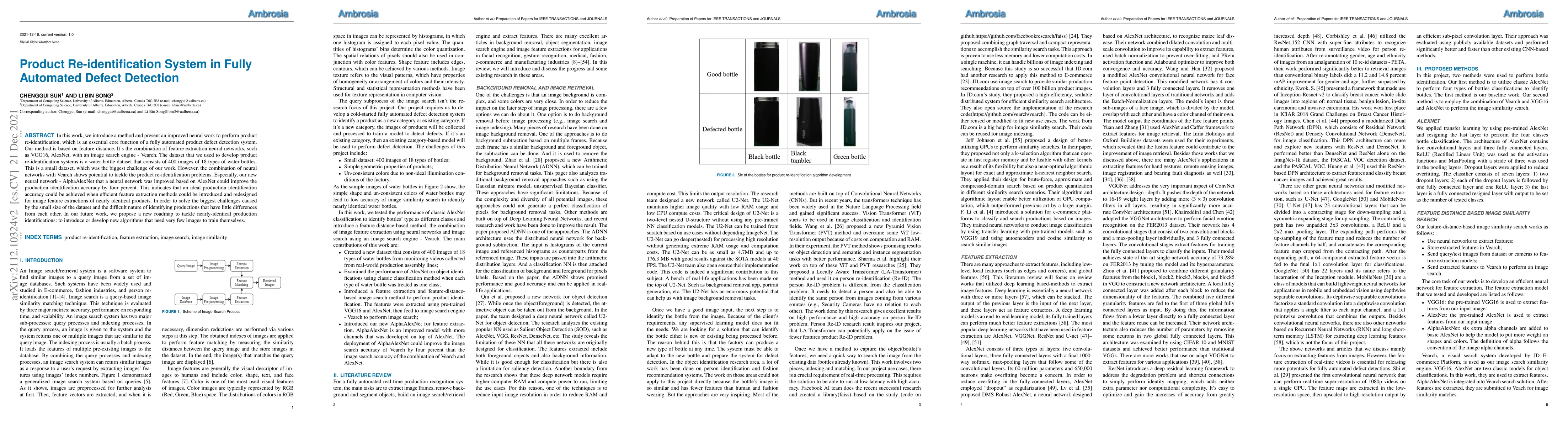 In this work, we introduce a method and present an improved neural work to perform product re-identification, which is an essential core function of a fully automated product defect detection system. Our method is based on feature distance. It is the combination of feature extraction neural networks, such as VGG16, AlexNet, with an image search engine - Vearch. The dataset that we used to develop product re-identification systems is a water-bottle dataset that consists of 400 images of 18 types of water bottles. This is a small dataset, which was the biggest challenge of our work. However, the combination of neural networks with Vearch shows potential to tackle the product re-identification problems. Especially, our new neural network - AlphaAlexNet that a neural network was improved based on AlexNet could improve the production identification accuracy by four percent. This indicates that an ideal production identification accuracy could be achieved when efficient feature extraction methods could be introduced and redesigned for image feature extractions of nearly identical products. In order to solve the biggest challenges caused by the small size of the dataset and the difficult nature of identifying productions that have little differences from each other. In our future work, we propose a new roadmap to tackle nearly-identical production identifications: to introduce or develop new algorithms that need very few images to train themselves.