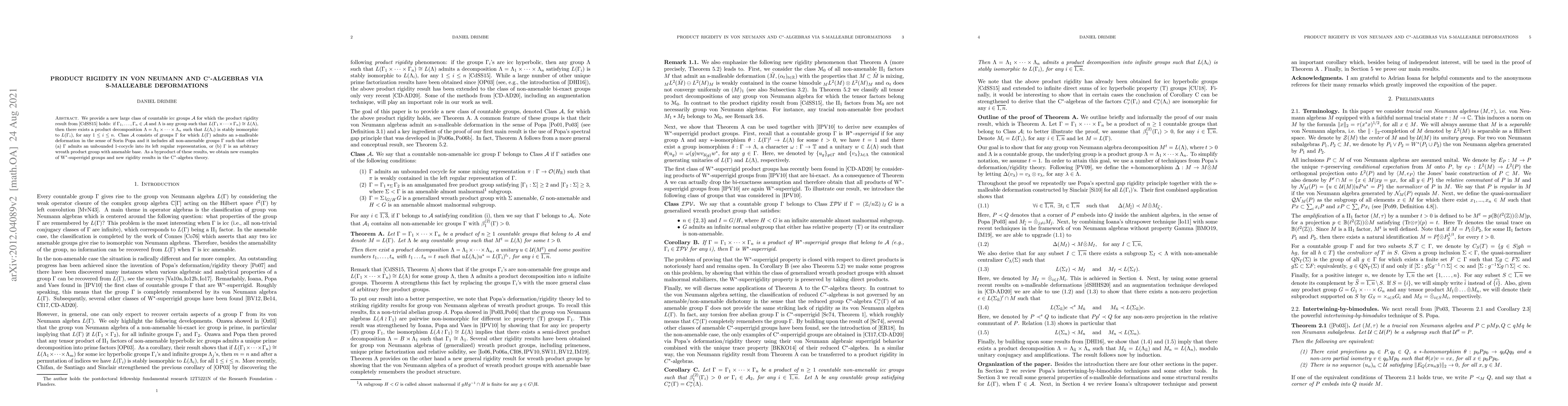 We provide a new large class of countable icc groups $\mathcal A$ for which the product rigidity result from [CdSS15] holds: if $\Gamma_1,\dots,\Gamma_n\in\mathcal A$ and $\Lambda$ is any group such that $L(\Gamma_1\times\dots\times\Gamma_n)\cong L(\Lambda)$, then there exists a product decomposition $\Lambda=\Lambda_1\times\dots\times \Lambda_n$ such that $L(\Lambda_i)$ is stably isomorphic to $L(\Gamma_i)$, for any $1\leq i\leq n$. Class $\mathcal A$ consists of groups $\Gamma$ for which $L(\Gamma)$ admits an s-malleable deformation in the sense of Sorin Popa and it includes all non-amenable groups $\Gamma$ such that either (a) $\Gamma$ admits an unbounded 1-cocycle into its left regular representation, or (b) $\Gamma$ is an arbitrary wreath product group with amenable base. As a byproduct of these results, we obtain new examples of W$^*$-superrigid groups and new rigidity results in the C$^*$-algebra theory.