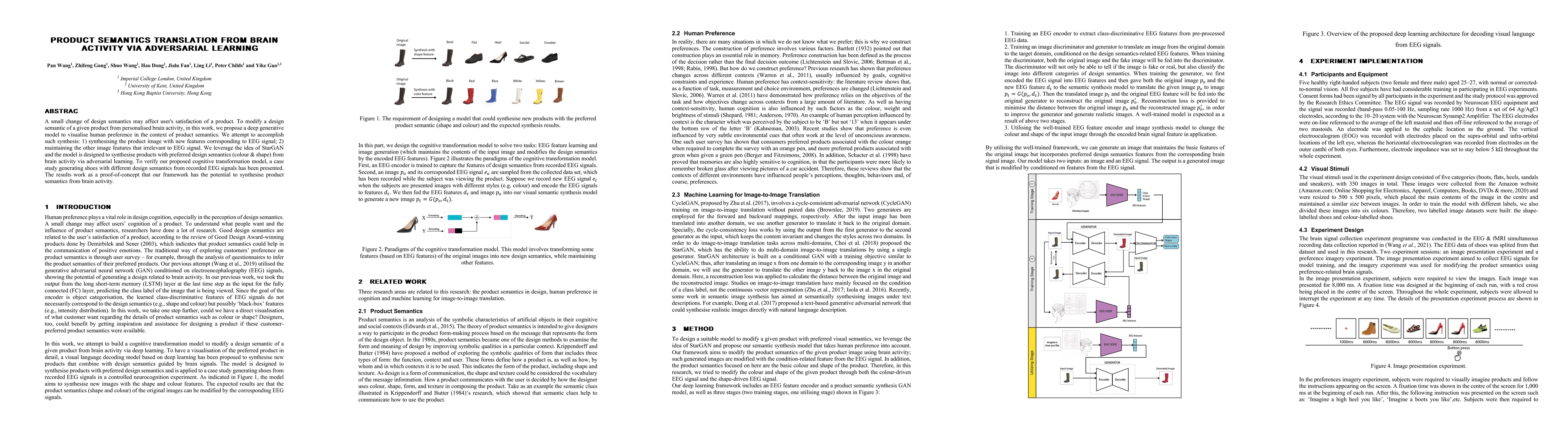 A small change of design semantics may affect a user's satisfaction with a product. To modify a design semantic of a given product from personalised brain activity via adversarial learning, in this work, we propose a deep generative transformation model to modify product semantics from the brain signal. We attempt to accomplish such synthesis: 1) synthesising the product image with new features corresponding to EEG signal; 2) maintaining the other image features that irrelevant to EEG signal. We leverage the idea of StarGAN and the model is designed to synthesise products with preferred design semantics (colour & shape) via adversarial learning from brain activity, and is applied with a case study to generate shoes with different design semantics from recorded EEG signals. To verify our proposed cognitive transformation model, a case study has been presented. The results work as a proof-of-concept that our framework has the potential to synthesis product semantic from brain activity.