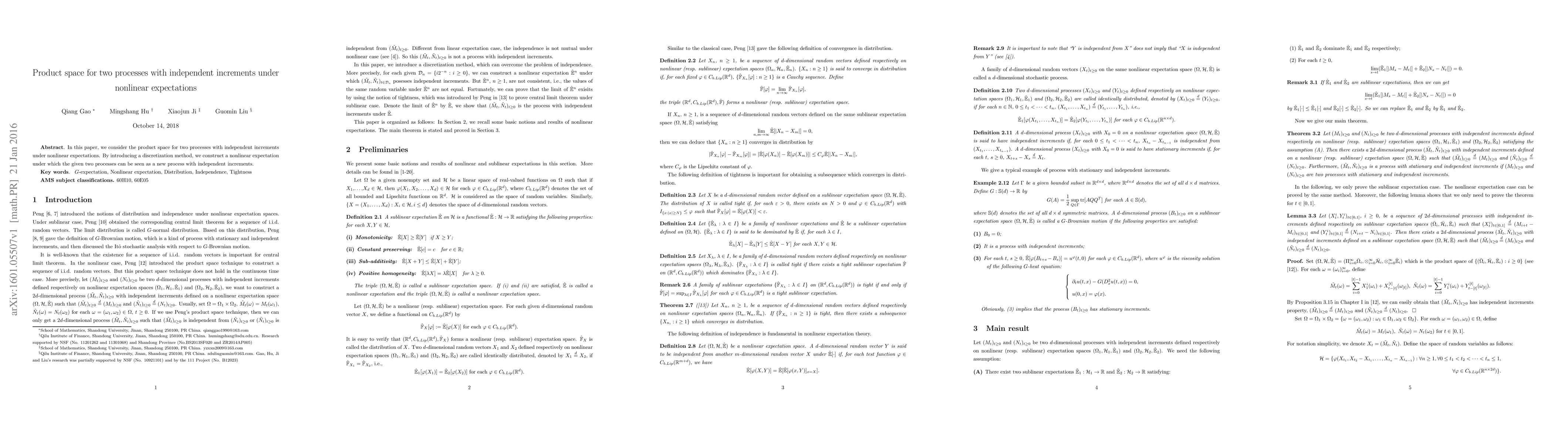 Summary: This paper explores the product space of two processes with independent increments under nonlinear expectations. It introduces a discretization method to construct a new nonlinear expectation where these processes exhibit independent increments.