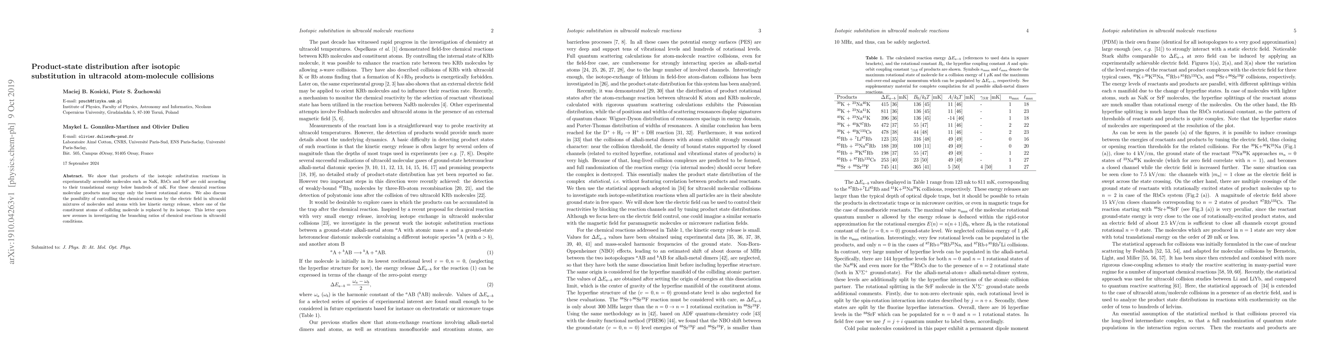 We show that products of the isotopic substitution reactions in experimentally accessible molecules such as NaK, RbCs, and SrF are cold according to their translational energy below hundreds of mK. For these chemical reactions, molecular products may occupy only the lowest rotational states. We also discuss the possibility of controlling the chemical reactions by the electric field in ultracold mixtures of molecules and atoms with low kinetic energy release, where one of the constituent atoms of colliding molecule is replaced by its isotope. This letter opens new avenues in investigating the branching ratios of chemical reactions in ultracold conditions.