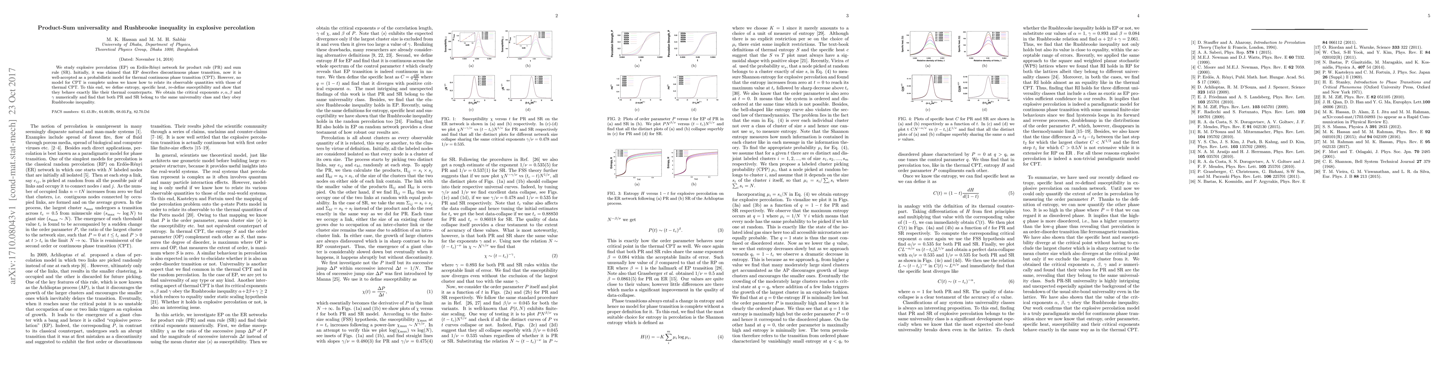 We study explosive percolation (EP) on Erd\"{o}s-R\'{e}nyi network for product rule (PR) and sum rule (SR). Initially, it was claimed that EP describes discontinuous phase transition, now it is well-accepted as a probabilistic model for thermal continuous phase transition (CPT). However, no model for CPT is complete unless we know how to relate its observable quantities with those of thermal CPT. To this end, we define entropy, specific heat, re-define susceptibility and show that they behave exactly like their thermal counterparts. We obtain the critical exponents $\nu, \alpha, \beta$ and $\gamma$ numerically and find that both PR and SR belong to the same universality class and they obey the Rushbrooke inequality.