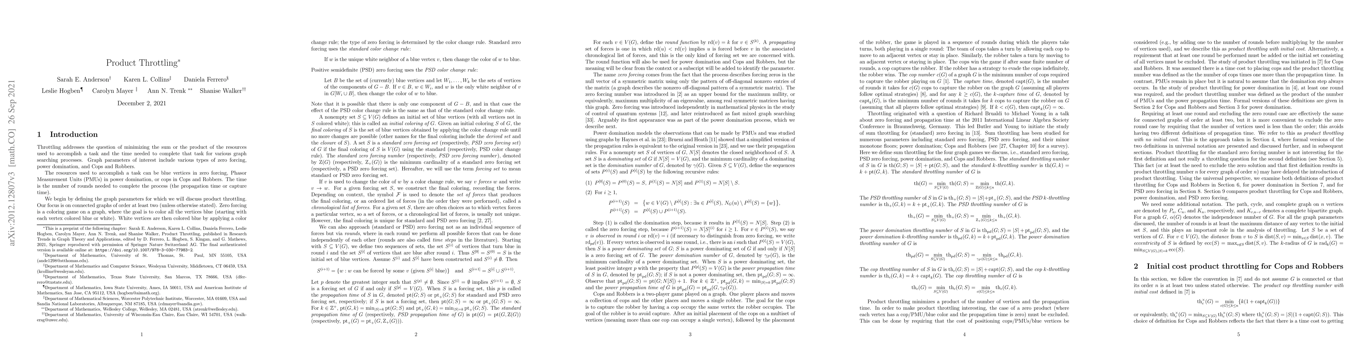 This paper surveys product throttling techniques aimed at minimizing resource usage and completion time in various graph searching processes like zero forcing, power domination, and Cops and Robbers. It focuses on how these methods optimize the product of resources and time.