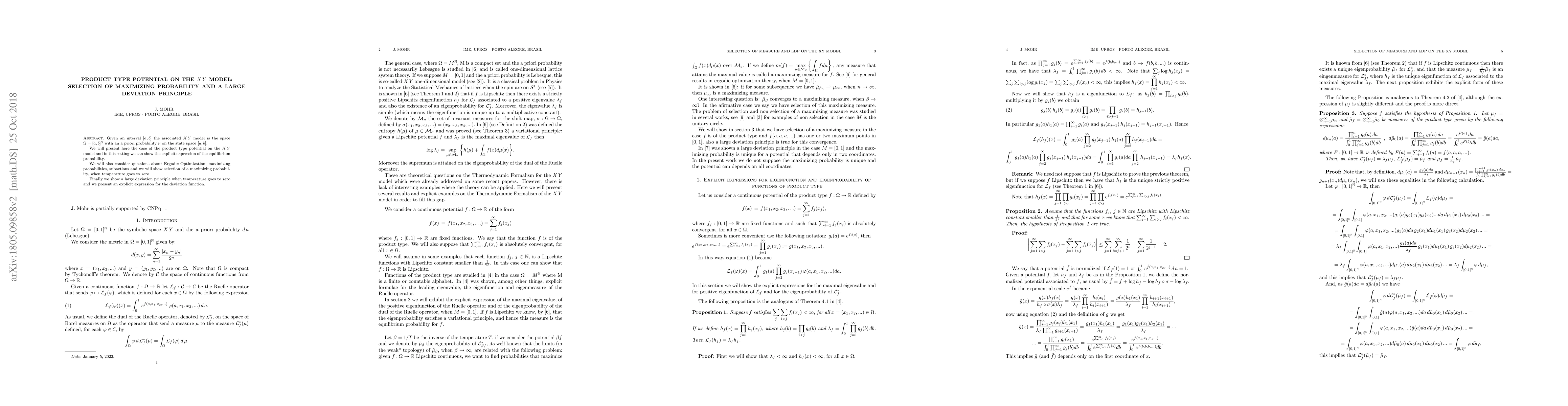 Given an interval $[a,b]$ the associated $X\,Y$ model is the space $\Omega=[a,b]^\mathbb{N}$ with an a priori probability $\nu $ on the state space $[a,b]$. We will present here the case of the product type potential on the $X\,Y$ model and in this setting we can show the explicit expression of the equilibrium probability. We will also consider questions about Ergodic Optimization, maximizing probabilities, subactions and we will show selection of a maximizing probability, when temperature goes to zero. Finally we show a large deviation principle when temperature goes to zero and we present an explicit expression for the deviation function.