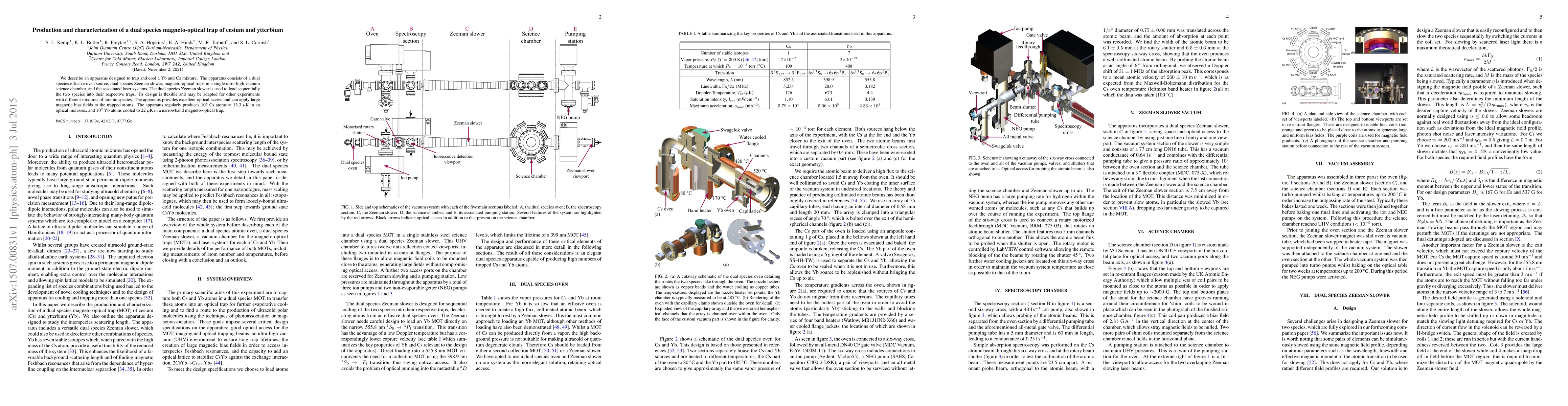 The paper presents a dual species magneto-optical trap for cesium and ytterbium atoms, featuring an apparatus with an effusive oven, Zeeman slower, and laser systems for cooling and trapping. The setup can produce 10${}^{8}$ Cs atoms at 13.3 $\mu$K and 10${}^{9}$ Yb atoms at 22 $\mu$K.