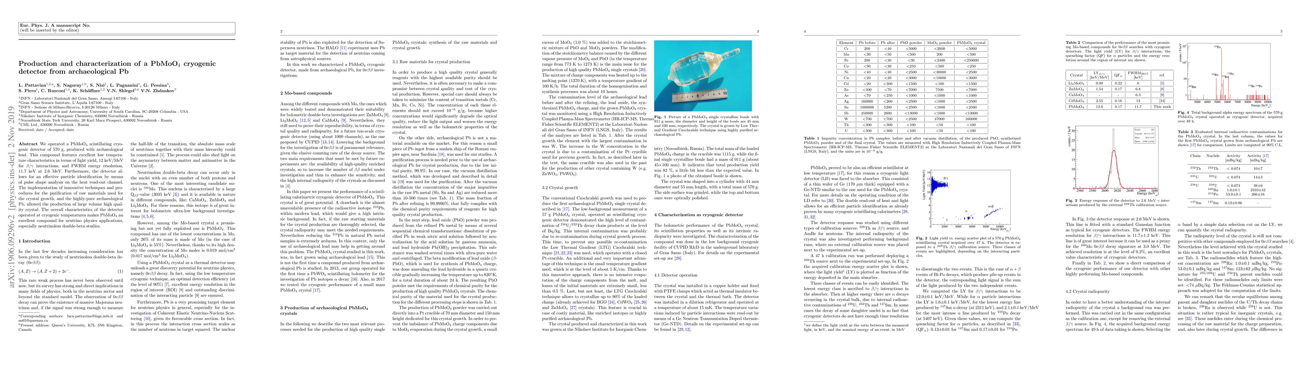 This paper details the production and characterization of a PbMoO$_4$ cryogenic detector using archaeological lead, showcasing excellent low-temperature performance, high light yield, and effective particle identification via pulse shape analysis. The detector's suitability for neutrino physics applications, especially for neutrinoless double-beta studies, is highlighted.
