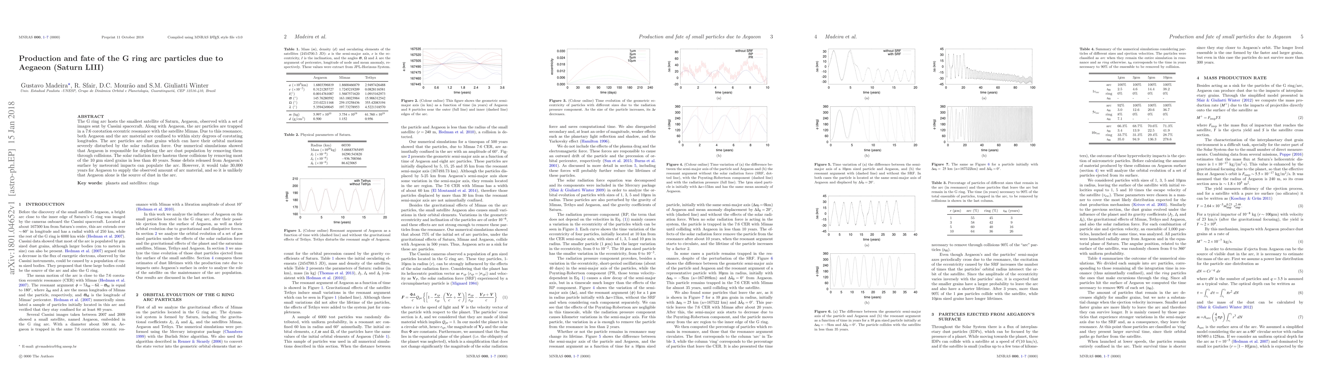 This research investigates the G ring arc particles associated with Saturn's moon Aegaeon, revealing that Aegaeon depletes the arc through collisions, while solar radiation force accelerates the removal of dust grains. It concludes that Aegaeon is not the primary source of the arc's dust, as it would take 30,000 years for it to supply the observed amount.