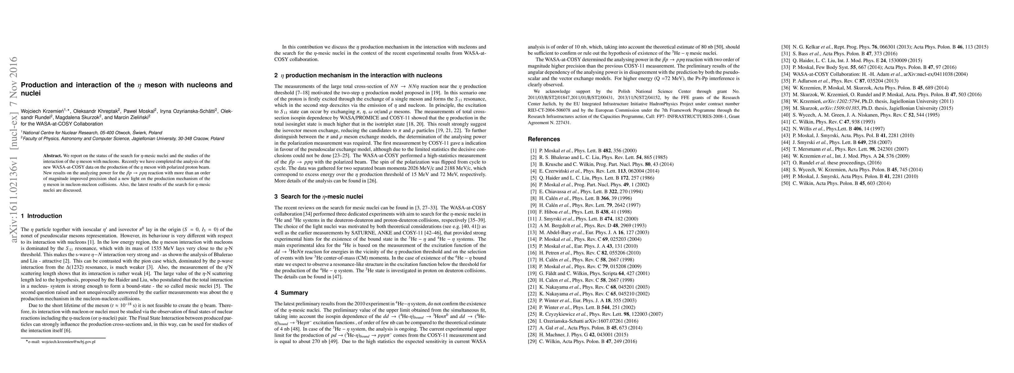 We report on the status of the search for eta-mesic nuclei and the studies of the interaction of the eta meson with nucleons. Recently we have completed the analysis of the new WASA-at-COSY data on the production of the eta meson with polarized proton beam. New results on the analyzing power for the pp->ppeta reaction with more than an order of magnitude improved precision shed a new light on the production mechanism of the eta meson in nucleon-nucleon collisions. Also, the latest results of the search for eta-mesic nuclei are discussed.