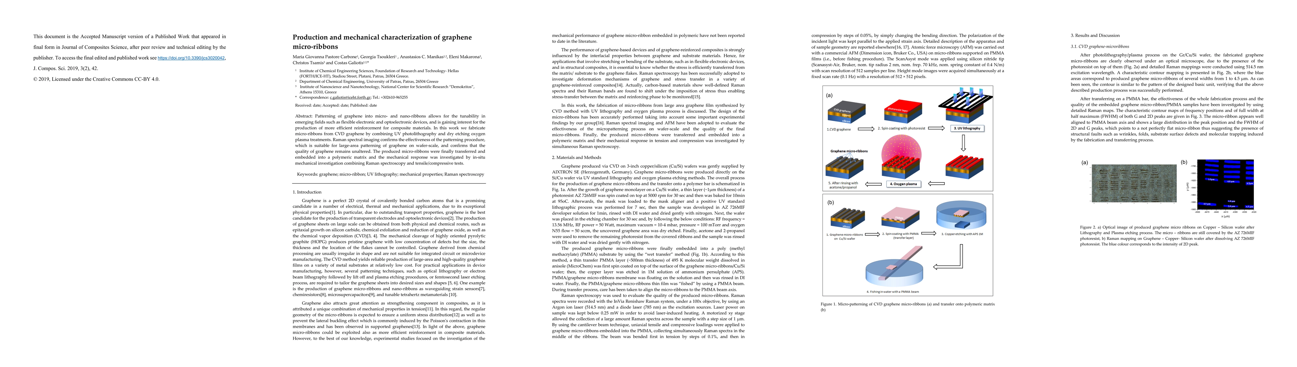 This paper details the fabrication of graphene micro-ribbons using CVD graphene, UV photolithography, and oxygen plasma etching, preserving graphene's quality. Mechanical characterization via tensile/compressive tests combined with Raman spectroscopy reveals the micro-ribbons' mechanical response when embedded in a polymeric matrix.