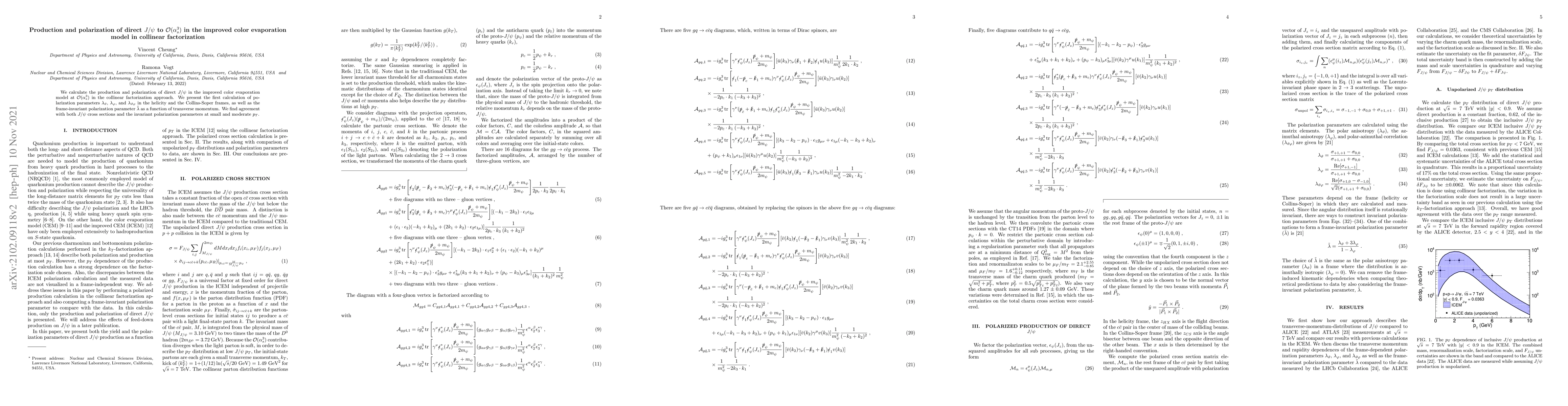 This paper calculates the production and polarization of direct $J/\psi$ mesons in the improved color evaporation model at $\mathcal{O}(\alpha_s^3)$ within collinear factorization, presenting the first results for polarization parameters $\lambda_\vartheta$, $\lambda_{\phi}$, $\lambda_{\vartheta\phi}$, and $\tilde{\lambda}$ as functions of transverse momentum, showing agreement with experimental data.