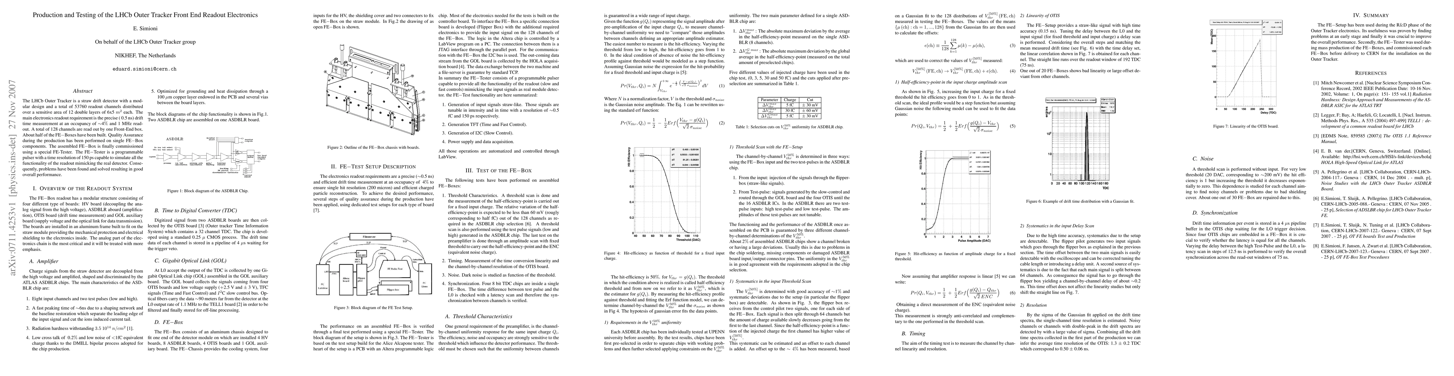 The LHCb Outer Tracker Front End readout electronics, comprising 53,760 channels, was developed to achieve precise 0.5 ns drift time measurements at high occupancy and readout rates. Testing of assembled FE-Boxes using a specialized FE-Tester with 150 ps resolution identified and resolved issues, leading to successful commissioning and satisfactory performance.