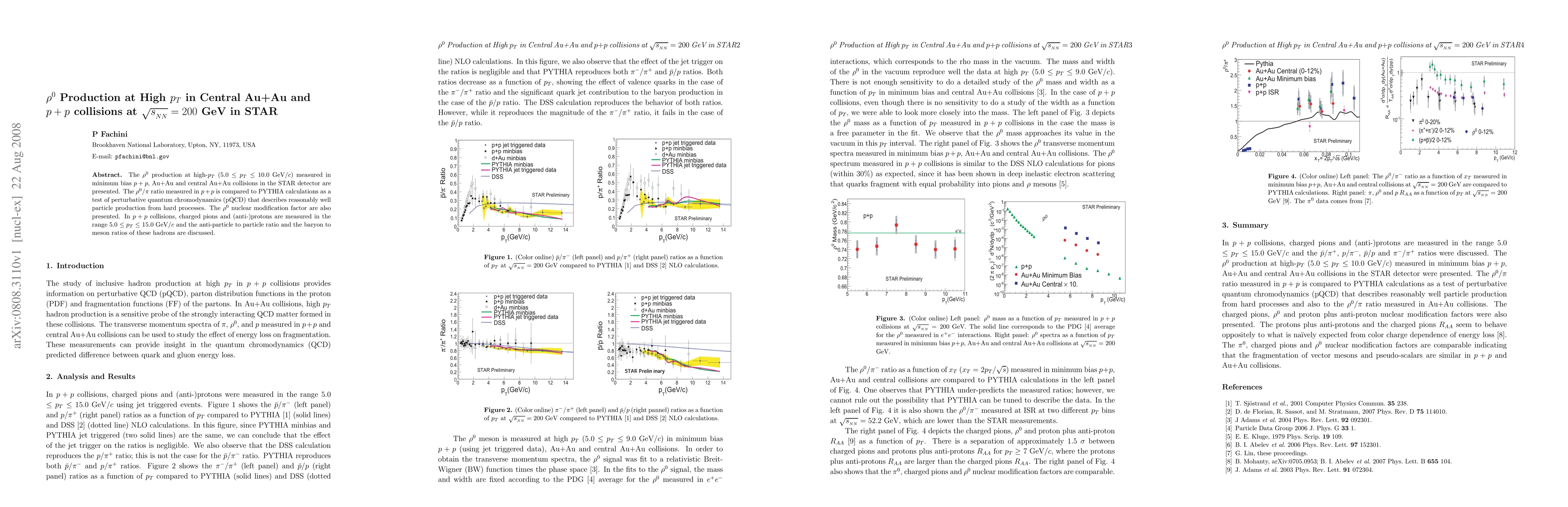 he $\rho^0$ production at high-$p_T$ (5.0 $\leq p_T \leq$ 10.0 GeV/$c$) measured in minimum bias $p+p$, Au+Au and central Au+Au collisions in the STAR detector are presented. The $\rho^0/\pi$ ratio measured in $p+p$ is compared to PYTHIA calculations as a test of perturbative quantum chromodynamics (pQCD) that describes reasonably well particle production from hard processes. The $\rho^0$ nuclear modification factor are also presented. In $p+p$ collisions, charged pions and (anti-)protons are measured in the range 5.0 $\leq p_T \leq$ 15.0 GeV/$c$ and the anti-particle to particle ratio and the baryon to meson ratios of these hadrons are discussed.