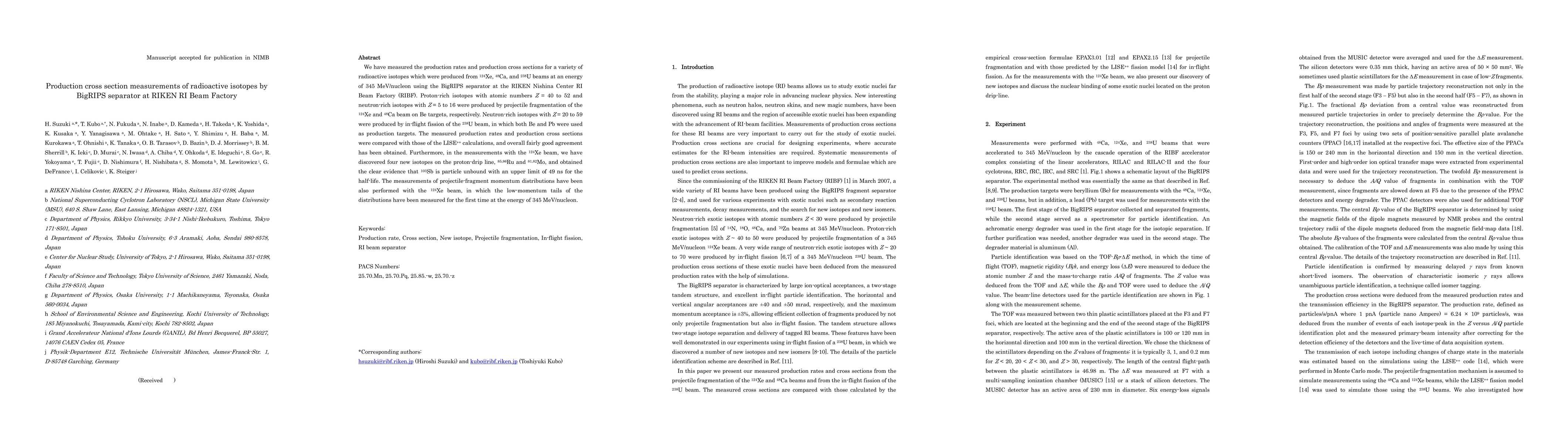 This study measures production rates and cross sections for various radioactive isotopes using the BigRIPS separator at RIKEN RI Beam Factory, comparing results with LISE++ calculations. New isotopes were discovered, and evidence was found for the particle unbinding of 103Sb, along with the first low-momentum tail measurements of projectile-fragment distributions at 345 MeV/nucleon.