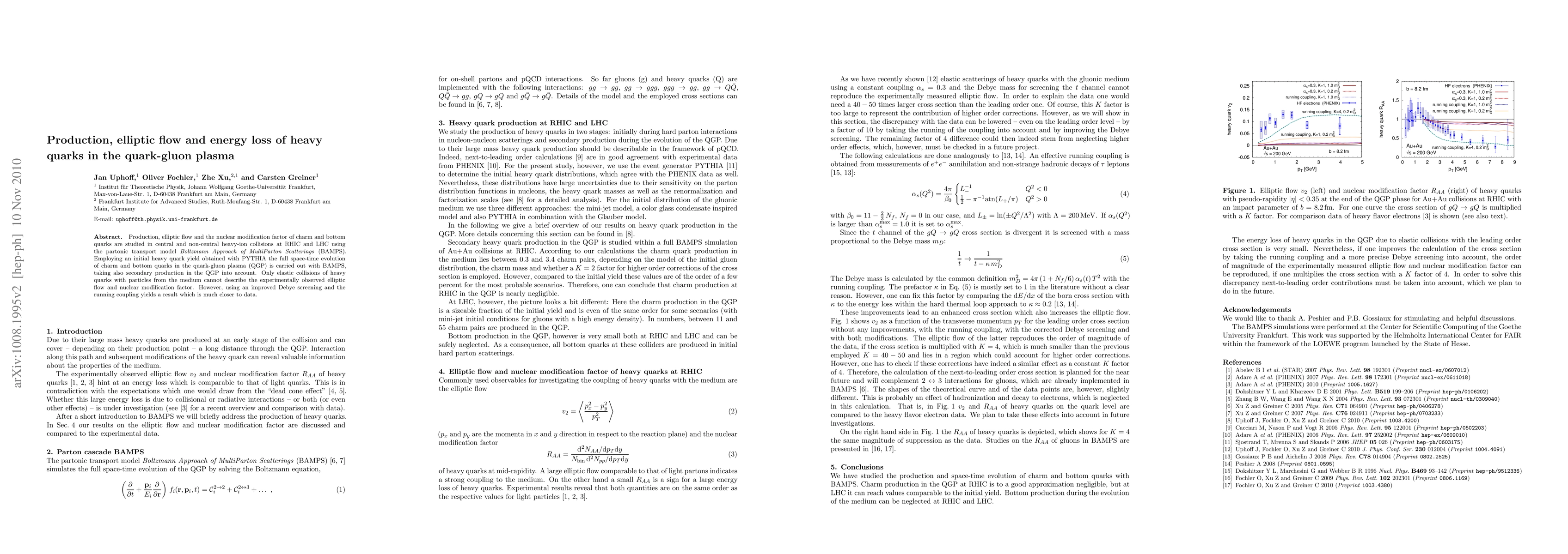 This paper investigates the production, elliptic flow, and energy loss of charm and bottom quarks in quark-gluon plasma using the BAMPS transport model. It finds that only elastic collisions alone cannot explain the observed elliptic flow and nuclear modification factor, but incorporating improved Debye screening and the running coupling provides a better match to experimental data.