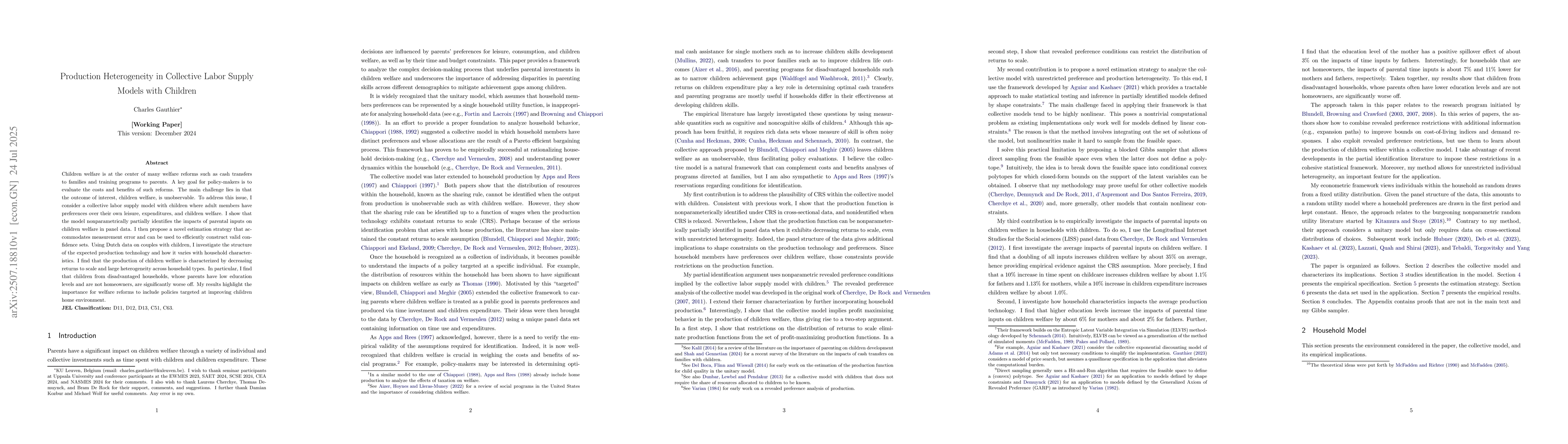 Children welfare is at the center of many welfare reforms such as cash transfers to families and training programs to parents. A key goal for policy-makers is to evaluate the costs and benefits of such reforms. The main challenge lies in that the outcome of interest, children welfare, is unobservable. To address this issue, I consider a collective labor supply model with children where adult members have preferences over their own leisure, expenditures, and children welfare. I show that the model nonparametrically partially identifies the impacts of parental inputs on children welfare in panel data. I then propose a novel estimation strategy that accommodates measurement error and can be used to efficiently construct valid confidence sets. Using Dutch data on couples with children, I investigate the structure of the expected production technology and how it varies with household characteristics. I find that the production of children welfare is characterized by decreasing returns to scale and large heterogeneity across household types. In particular, I find that children from disadvantaged households, whose parents have low education levels and are not homeowners, are significantly worse off. My results highlight the importance for welfare reforms to include policies targeted at improving children home environment.