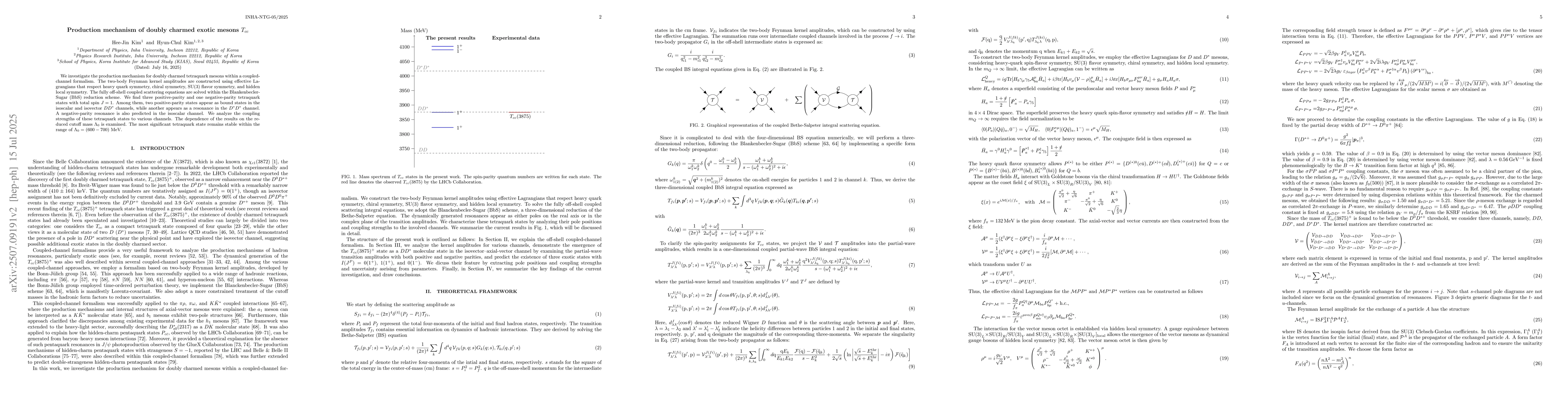We investigate the production mechanism for doubly charmed tetraquark mesons within a coupled-channel formalism. The two-body Feynman kernel amplitudes are constructed using effective Lagrangians that respect heavy quark symmetry, chiral symmetry, SU(3) flavor symmetry, and hidden local symmetry. The fully off-shell coupled scattering equations are solved within the Blankenbecler-Sugar (BbS) reduction scheme. We find three positive-parity and one negative-parity tetraquark states with total spin $J=1$. Among them, two positive-parity states appear as bound states in the isoscalar and isovector $DD^*$ channels, while another appears as a resonance in the $D^*D^*$ channel. A negative-parity resonance is also predicted in the isoscalar channel. We analyze the coupling strengths of these tetraquark states to various channels. The dependence of the results on the reduced cutoff mass $\Lambda_0$ is examined. The most significant tetraquark state remains stable within the range of $\Lambda_0=(600-700)$ MeV.