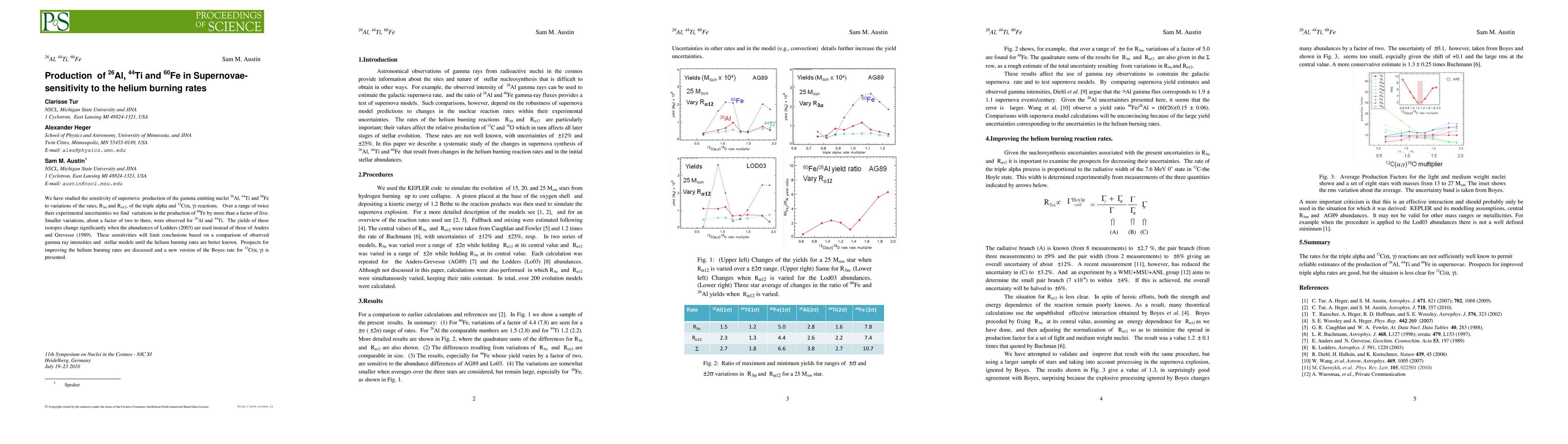This paper investigates the impact of variations in helium burning rates on the production of gamma-emitting isotopes 26Al, 44Ti, and 60Fe in supernovae, finding significant changes in yields, particularly for 60Fe. Improved knowledge of helium burning rates is essential for accurate comparisons between observed gamma ray intensities and stellar models.