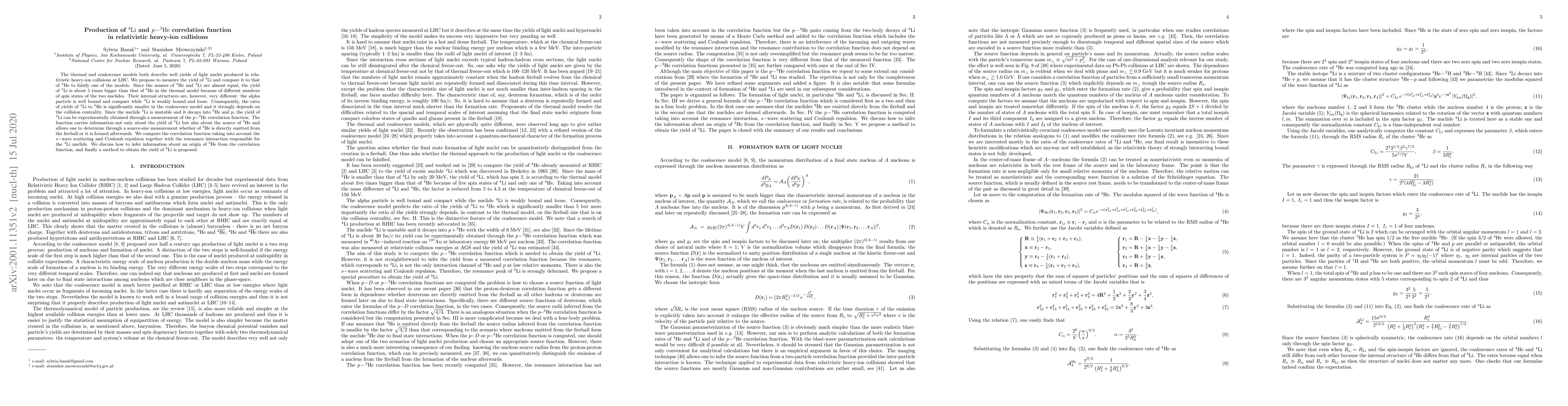 The thermal and coalescence models both describe well yields of light nuclei produced in relativistic heavy-ion collisions at LHC. We propose to measure the yield of $^4{\rm Li}$ and compare it to that of $^4{\rm He}$ to falsify one of the models. Since the masses of $^4{\rm He}$ and $^4{\rm Li}$ are almost equal, the yield of $^4{\rm Li}$ is about 5 times bigger than that of $^4{\rm He}$ in the thermal model because of different numbers of spin states of the two nuclides. Their internal structures are, however, very different: the alpha particle is well bound and compact while $^4{\rm Li}$ is weakly bound and loose. Consequently, the ratio of yields of $^4{\rm Li}$ to $^4{\rm He}$ is significantly smaller in the coalescence model and it strongly depends on the collision centrality. Since the nuclide $^4{\rm Li}$ is unstable and it decays into $^3{\rm He}$ and $p$, the yield of $^4{\rm Li}$ can be experimentally obtained through a measurement of the $p\!-\!^3{\rm He}$ correlation function. The function carries information not only about the yield of $^4{\rm Li}$ but also about the source of $^3{\rm He}$ and allows one to determine through a source-size measurement whether of $^3{\rm He}$ is directly emitted from the fireball or it is formed afterwards. We compute the correlation function taking into account the $s-$wave scattering and Coulomb repulsion together with the resonance interaction responsible for the $^4{\rm Li}$ nuclide. We discuss how to infer information about an origin of $^3{\rm He}$ from the correlation function, and finally a method to obtain the yield of $^4{\rm Li}$ is proposed.