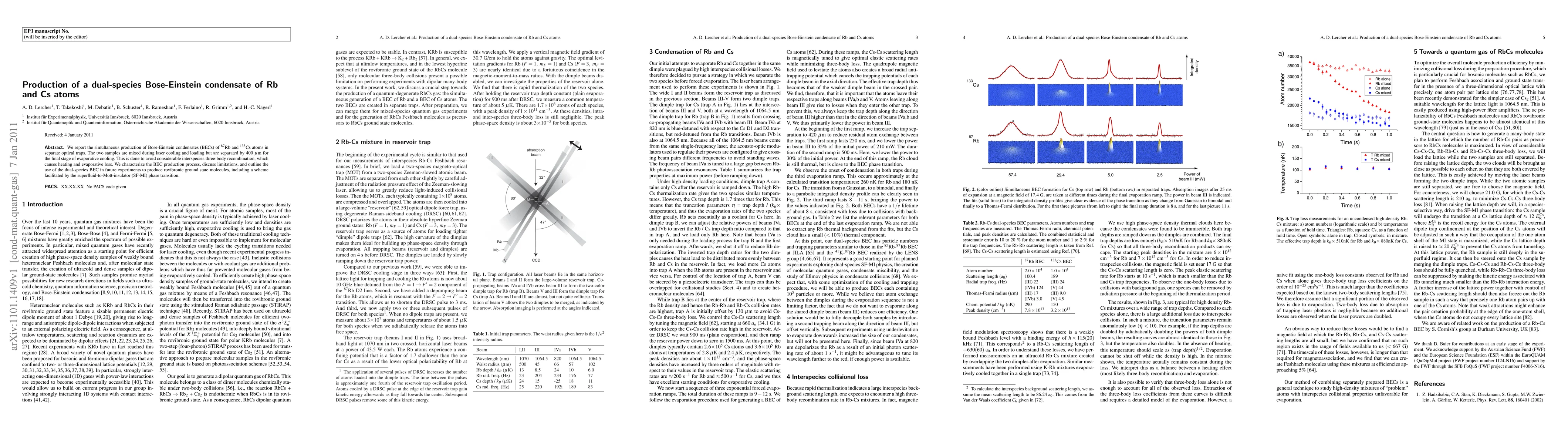 This study reports the simultaneous production of dual-species Bose-Einstein condensates (BECs) of $^{87}$Rb and $^{133}$Cs atoms, separated in separate optical traps to avoid interspecies three-body recombination losses. The potential applications of these dual-species BECs, including the creation of rovibronic ground state molecules via a superfluid-to-Mott-insulator phase transition, are also discussed.