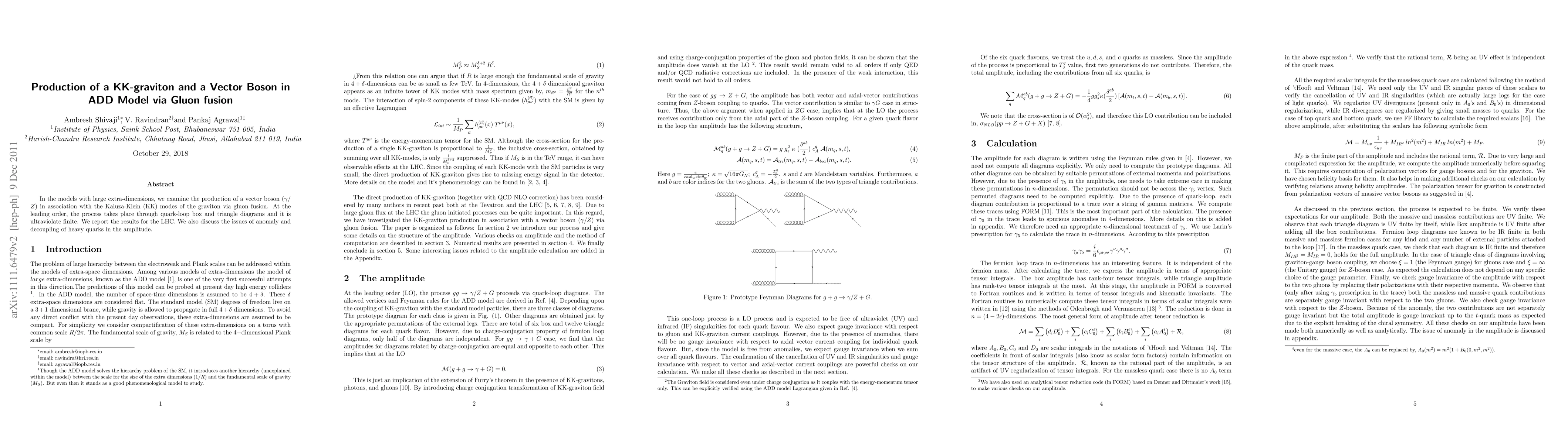 In the models with large extra-dimensions, we examine the production of a vector boson (\gamma / Z) in association with the Kaluza-Klein (KK) modes of the graviton via gluon fusion. At the leading order, the process takes place through quark-loop box and triangle diagrams and it is ultraviolate finite. We report the results for the LHC. We also discuss the issues of anomaly and decoupling of heavy quarks in the amplitude.