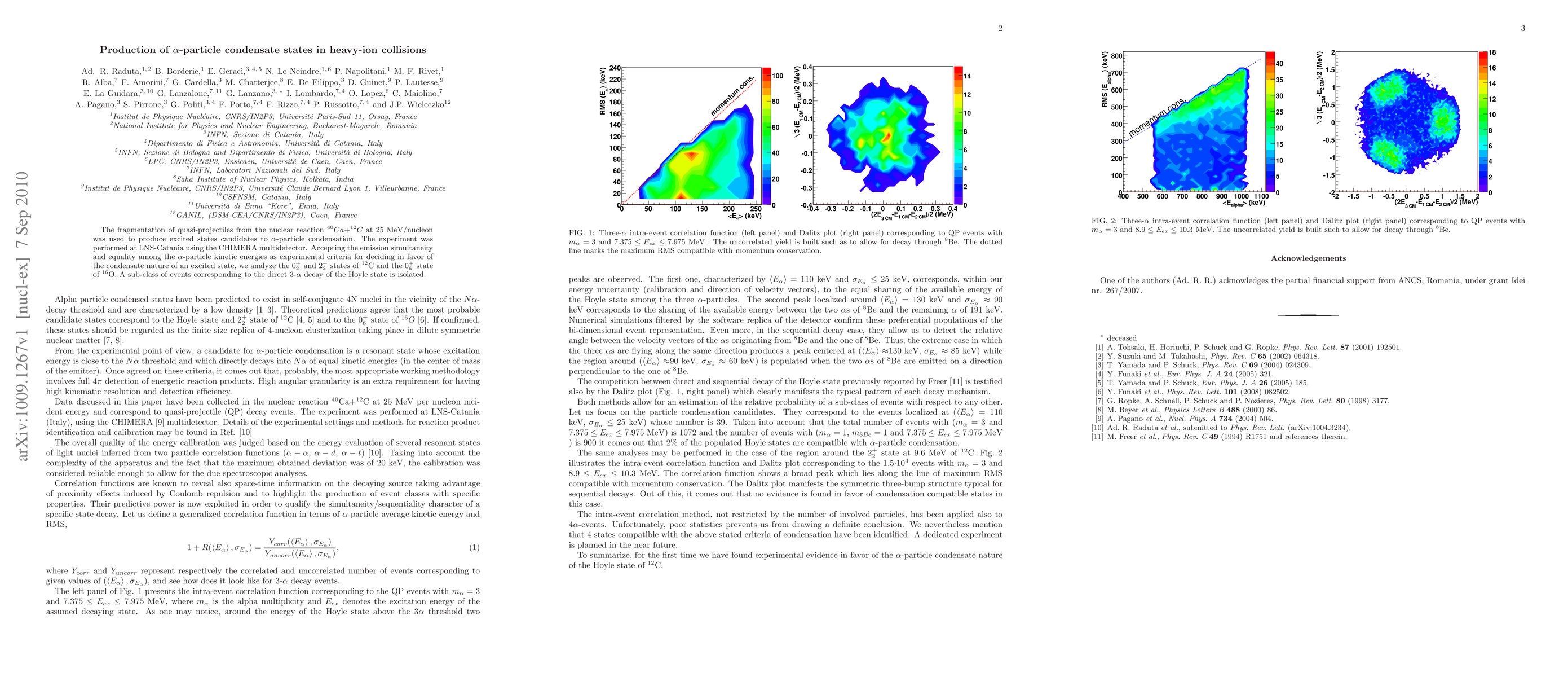 The fragmentation of quasi-projectiles from the nuclear reaction $^{40}Ca$ + $^{12}C$ at 25 MeV/nucleon was used to produce excited states candidates to $\alpha$-particle condensation. The experiment was performed at LNS-Catania using the CHIMERA multidetector. Accepting the emission simultaneity and equality among the $\alpha$-particle kinetic energies as experimental criteria for deciding in favor of the condensate nature of an excited state, we analyze the $0_2^+$ and $2_2^+$ states of $^{12}$C and the $0_6^+$ state of $^{16}$O. A sub-class of events corresponding to the direct 3-$\alpha$ decay of the Hoyle state is isolated.