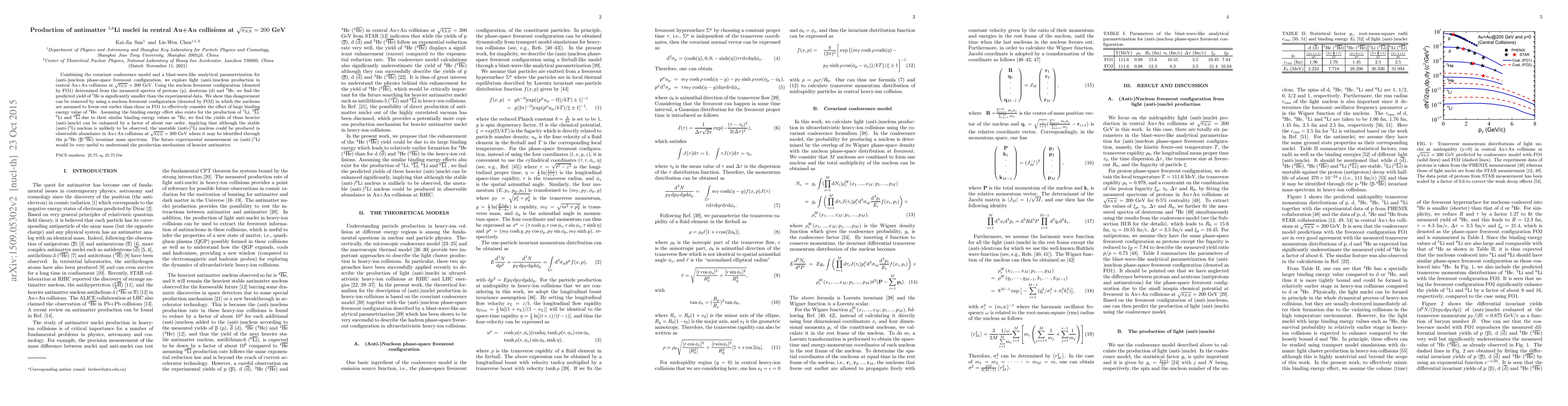 Combining the covariant coalescence model and a blast-wave-like analytical parametrization for (anti-)nucleon phase-space freezeout configuration, we explore light (anti-)nucleus production in central Au+Au collisions at $\sqrt{s_{NN}} = 200$ GeV. Using the nucleon freezeout configuration (denoted by FO1) determined from the measured spectra of protons (p), deutrons (d) and $^{3}$He, we find the predicted yield of $^{4}$He is significantly smaller than the experimental data. We show this disagreement can be removed by using a nucleon freezeout configuration (denoted by FO2) in which the nucleons are assumed to freeze out earlier than those in FO1 to effectively consider the effect of large binding energy value of $^{4}$He. Assuming the binding energy effect also exists for the production of $^5\text{Li}$, $^5\overline{\text{Li}}$, $^6\text{Li}$ and $^6\overline{\text{Li}}$ due to their similar binding energy values as $^{4}$He, we find the yields of these heavier (anti-)nuclei can be enhanced by a factor of about one order, implying that although the stable (anti-)$^6$Li nucleus is unlikely to be observed, the unstable (anti-)$^5$Li nucleus could be produced in observable abundance in Au+Au collisions at $\sqrt{s_{NN}} = 200$ GeV where it may be identified through the p-$^4\text{He}$ ($\overline{\text{p}}$-$^4\overline{\text{He}}$) invariant mass spectrum. The future experimental measurement on (anti-)$^5\text{Li}$ would be very useful to understand the production mechanism of heavier antimatter.