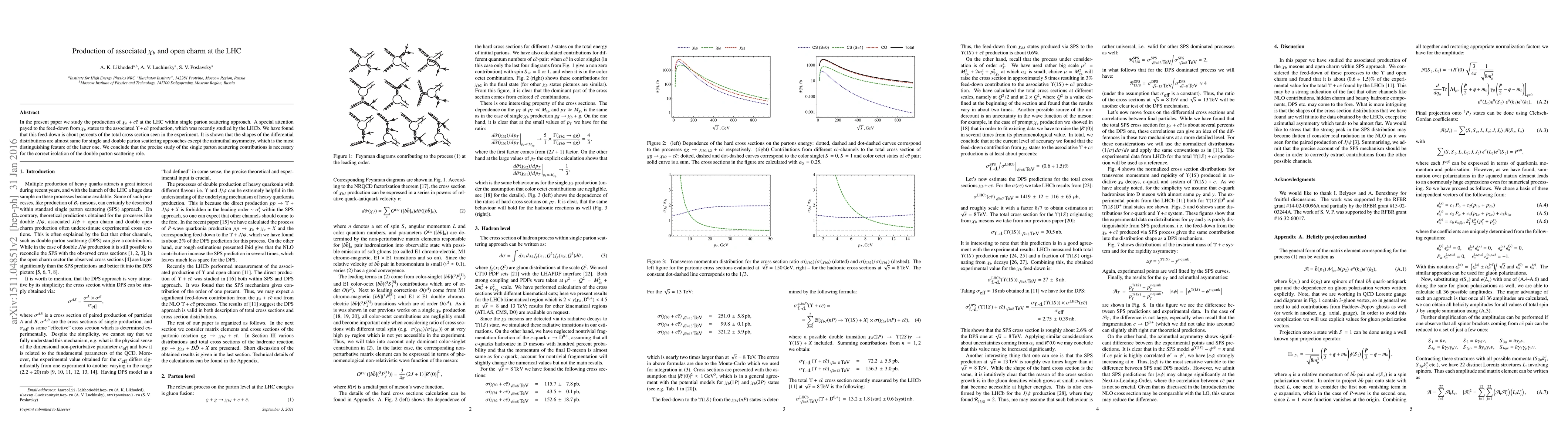 In the present paper we study the production of $\chi_b + c\bar c$ at the LHC within single parton scattering approach. A special attention payed to the feed-down from $\chi_b$ states to the associated $\Upsilon + c\bar c$ production, which was recently studied by the LHCb. We have found that this feed-down is about percents of the total cross section seen in the experiment. It is shown that the shapes of the differential distributions are almost same as found by the LHCb except the azimuthal asymmetry, which is almost flat in the experiment. We conclude that the precise study of the single parton scattering contributions is necessary for the correct isolation of other possible production channels such as double parton scattering.
