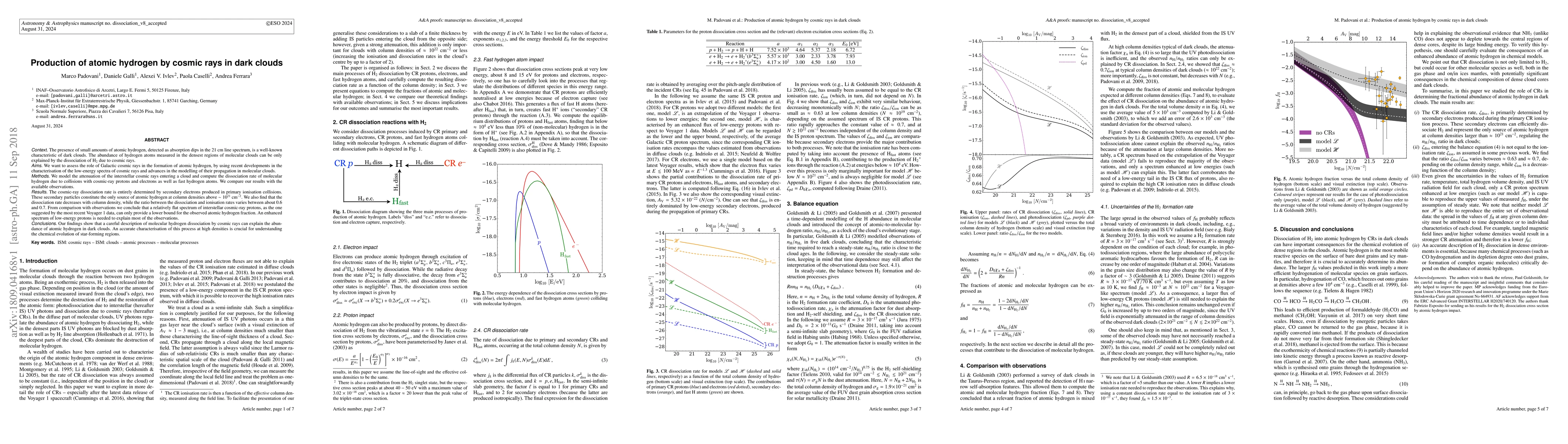 A study found that cosmic rays cause dissociation of hydrogen molecules in dark clouds, producing atomic hydrogen, which is more abundant than previously thought when using a flat interstellar proton spectrum. An enhanced low-energy proton spectrum is needed to explain most observations.