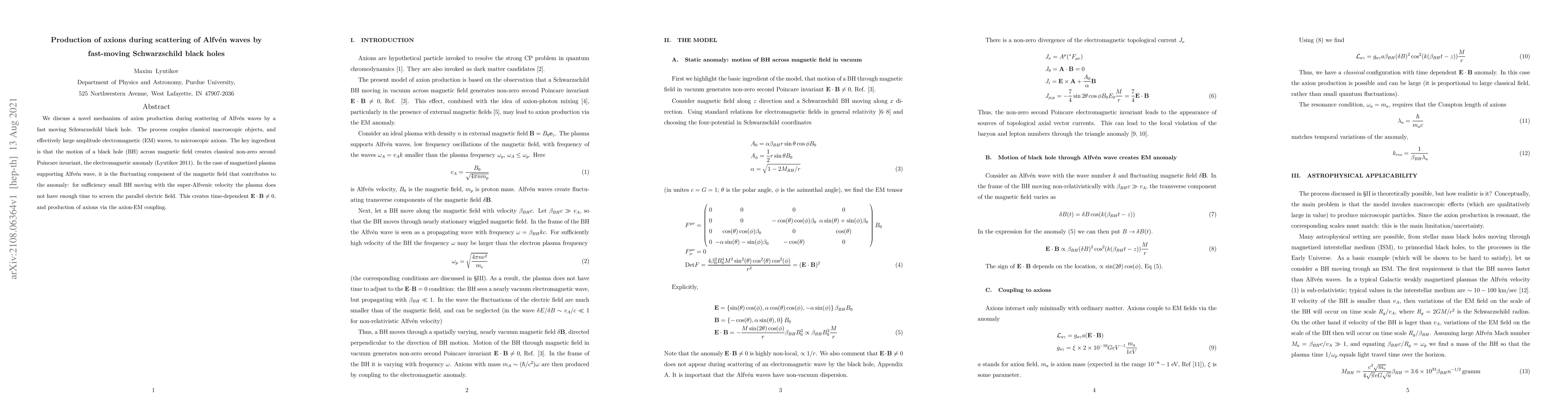 Summary: This paper explores axion production through the scattering of Alfven waves by fast-moving Schwarzschild black holes, linking macroscopic electromagnetic waves with microscopic axions. The mechanism hinges on the black hole's motion across magnetic fields generating a time-dependent electromagnetic anomaly, leading to axion generation via axion-EM coupling.