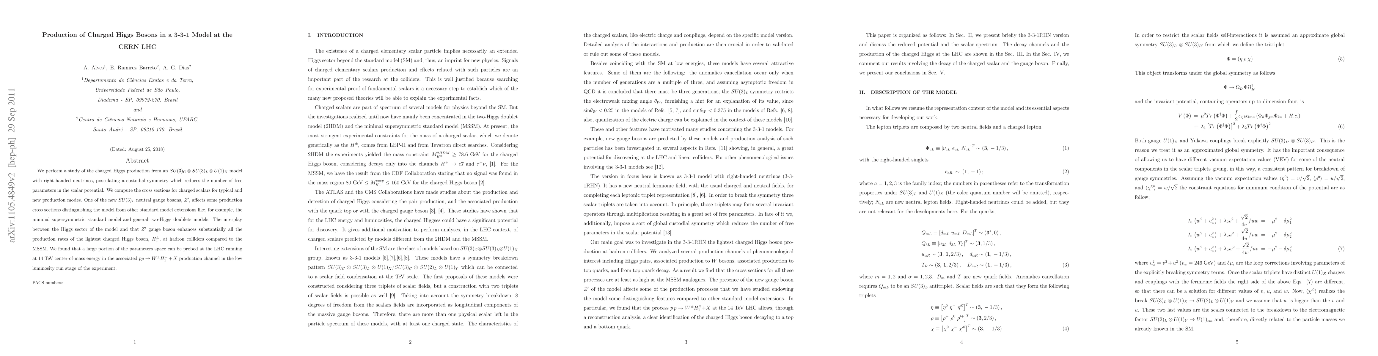 We perform a study of the charged Higgs production from an $SU(3)_{C}\otimes SU(3)_{L}\otimes U(1)_{X}$ model with right-handed neutrinos, postulating a custodial symmetry which reduces the number of free parameters in the scalar potential. We compute the cross sections for charged scalars for typical and new production modes. One of the new $SU(3)_{L}$ neutral gauge bosons, $Z^{\prime}$, affects some production cross sections distinguishing the model from other Standard Model extensions like, for example, the Minimal Supersymmetric Standard Model and general two Higgs doublets models. The interplay between the Higgs sector of the model and that $Z^{\prime}$ gauge boson enhances substantialy all the production rates of the lightest charged Higgs boson, $H_{1}^{\pm}$, at hadron colliders compared to the MSSM. We found that a large portion of the parameters space can be probed at the LHC running at 14 TeV center-of-mass energy in the associated $pp\rightarrow W^{\pm}H_{1}^{\mp}+X$ production channel in the low luminosity run stage of the experiment.