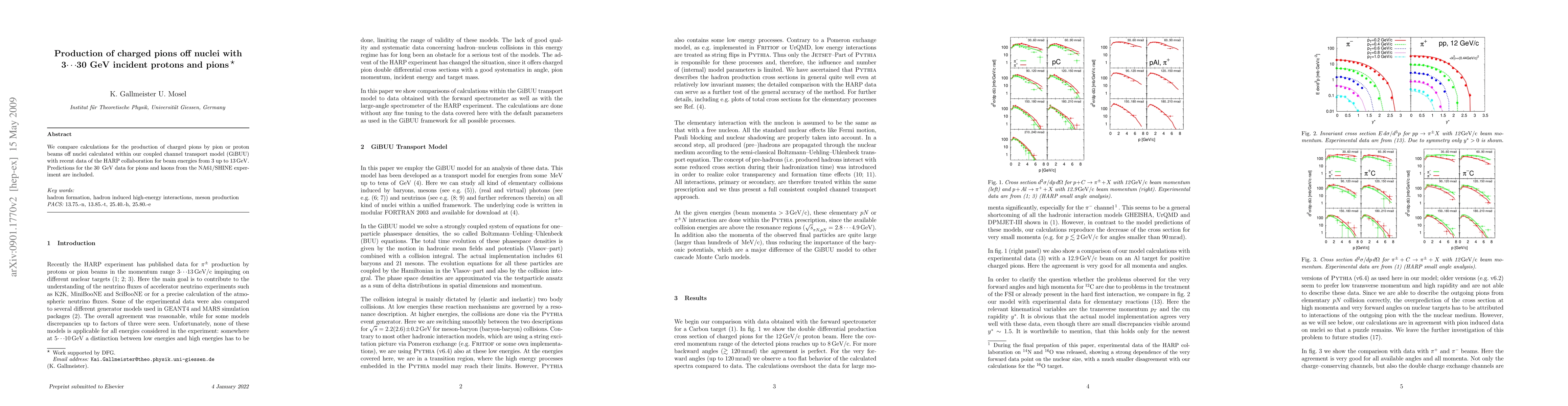 We compare calculations for the production of charged pions by pion or proton beams off nuclei calculated within our coupled channel transport model (GiBUU) with recent data of the HARP collaboration for beam energies from 3 up to 13 GeV. Predictions for the 30 GeV data for pions and kaons from the NA61/SHINE experiment are included.
