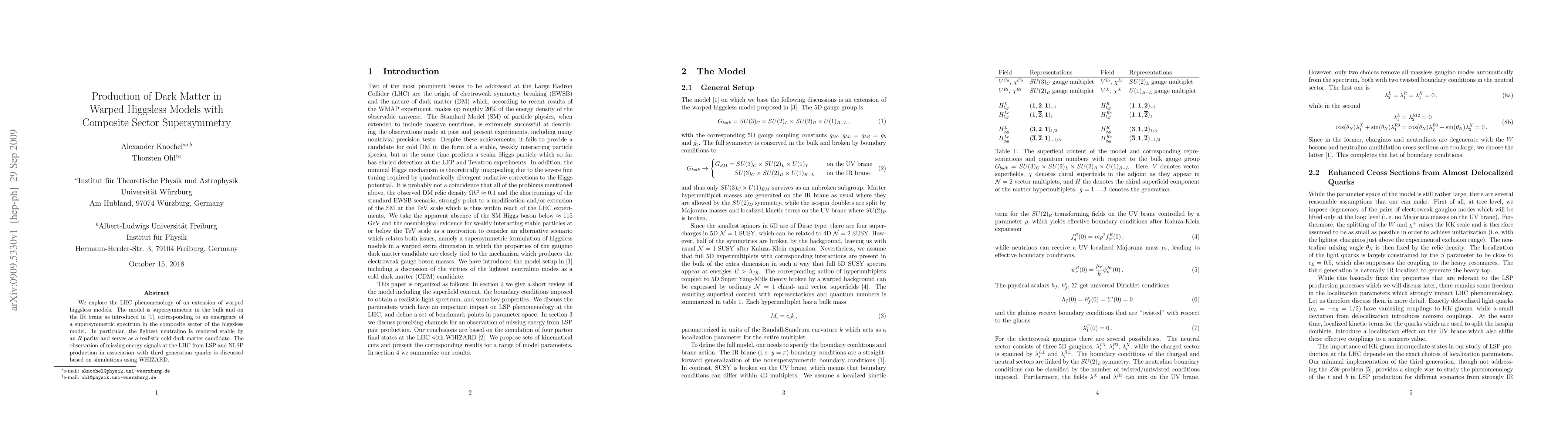This paper investigates the production of dark matter in extended warped higgsless models with composite sector supersymmetry, proposing the lightest neutralino as a stable, R-parity-protected cold dark matter candidate. It discusses potential LHC signals from missing energy due to neutralino and next-to-lightest supersymmetric particle production in association with third-generation quarks.
