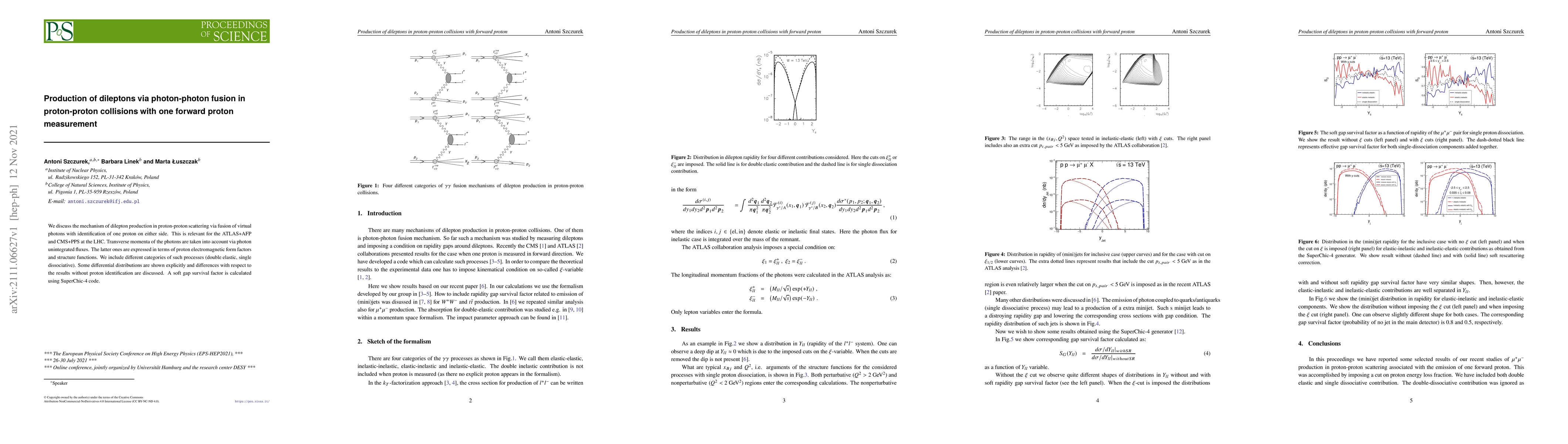 This paper explores dilepton production in proton-proton collisions through photon-photon fusion, with one proton identified forward. It considers various processes and differential distributions, comparing results with and without proton identification, and uses the SuperChic-4 code to calculate a soft gap survival factor.