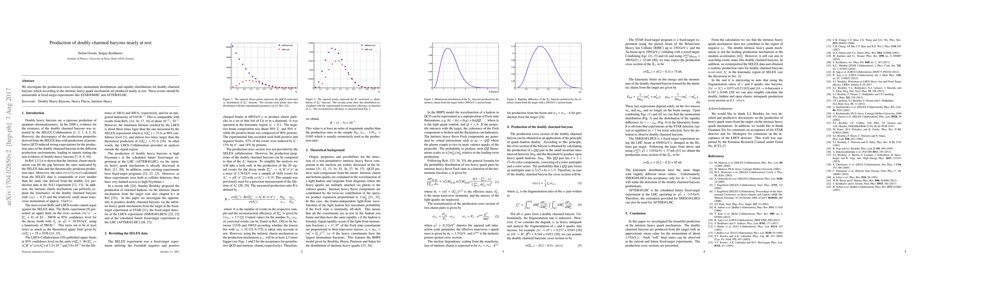 We investigate the production cross sections, momentum distributions and rapidity distributions for doubly charmed baryons which according to the intrinsic heavy quark mechanism are produced nearly at rest. These events should be measurable at fixed-target experiments like STAR@RHIC and AFTER@LHC.