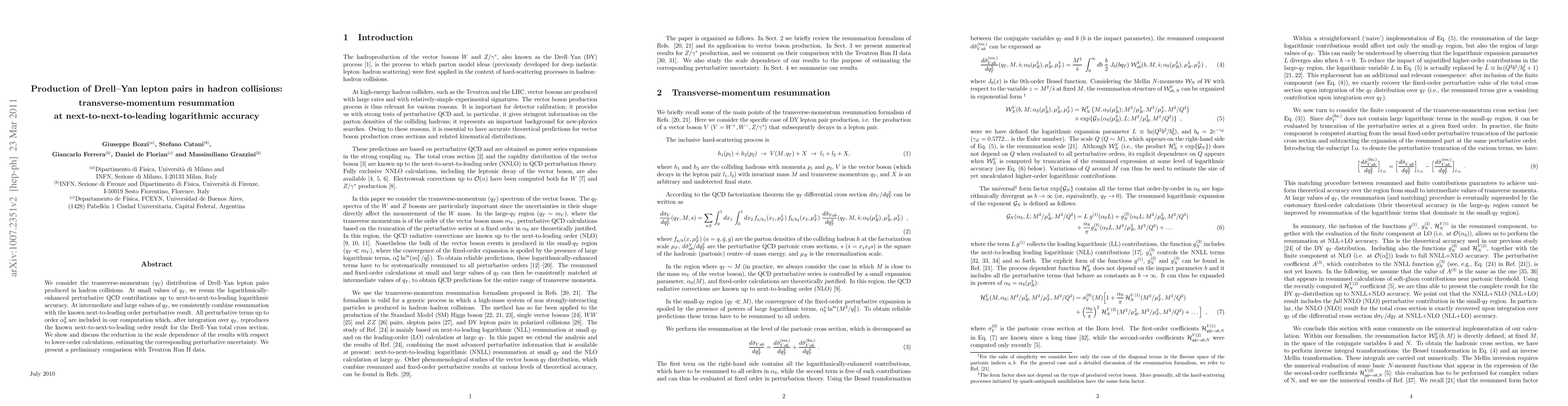 This paper presents a detailed analysis of the transverse-momentum distribution of Drell-Yan lepton pairs in hadron collisions, employing resummation techniques up to next-to-next-to-leading logarithmic accuracy. The study combines these resummations with next-to-leading order perturbative results, significantly reducing scale dependence and perturbative uncertainty compared to lower-order calculations.