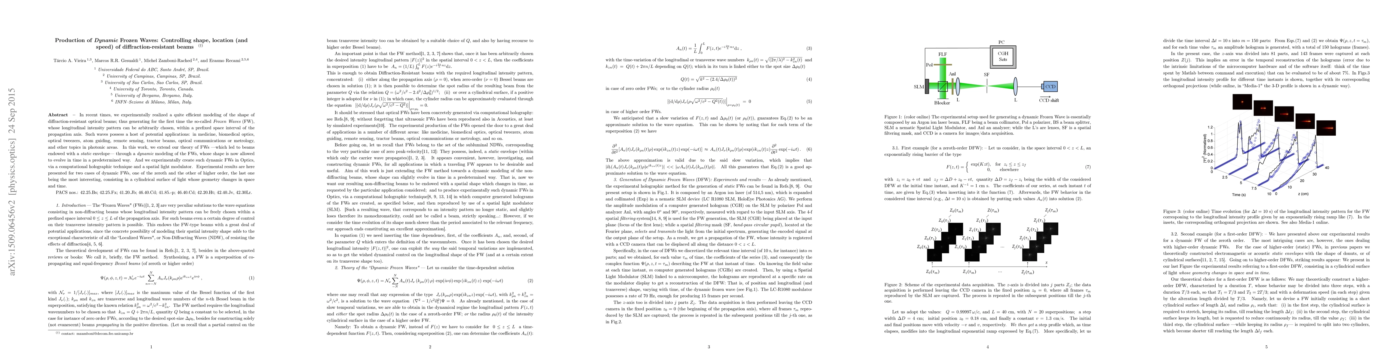 This paper presents an experimental realization of dynamic Frozen Waves (FWs) that can control the shape, location, and speed of diffraction-resistant optical beams. The authors extend their static FW theory to a dynamic model, generating beams with evolving shapes via computational holography and a spatial light modulator, showcasing applications in various photonic fields.