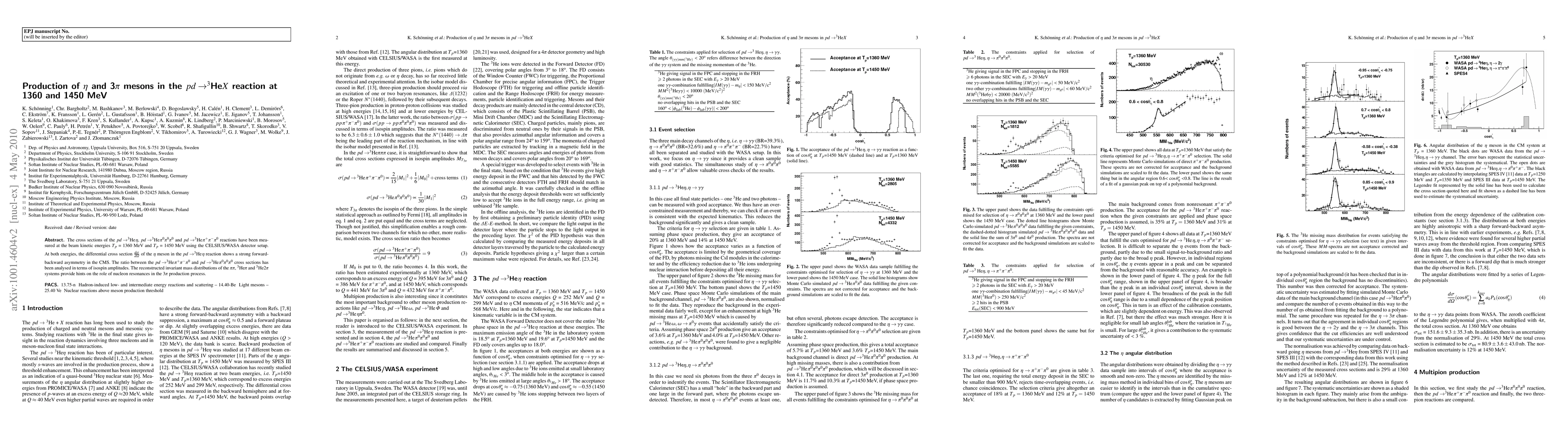 This study measures the cross sections for pd -> 3He eta, pd -> 3He pi0 pi0 pi0, and pd -> 3He pi+ pi- pi0 reactions at 1360 and 1450 MeV, revealing a strong forward-backward asymmetry for the eta meson and insights into nucleon resonances from invariant mass distributions.