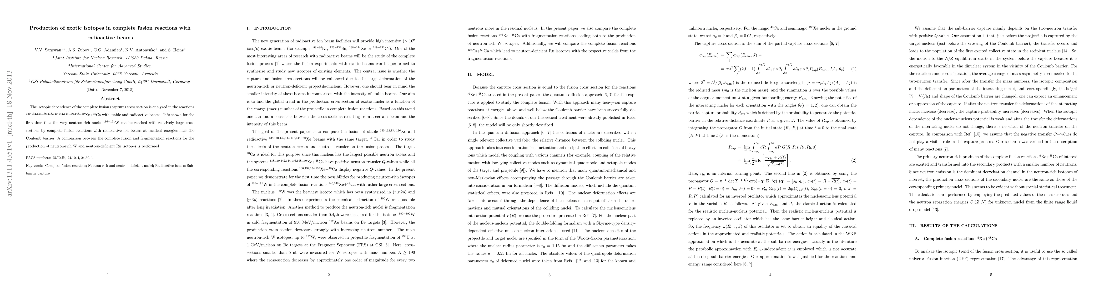 This study analyzes the production of exotic isotopes via complete fusion reactions using radioactive beams, demonstrating that neutron-rich tungsten isotopes $^{186-191}$W can be produced with significant cross sections near the Coulomb barrier. It compares fusion and fragmentation processes for generating neutron-rich tungsten versus neutron-deficient radon isotopes.