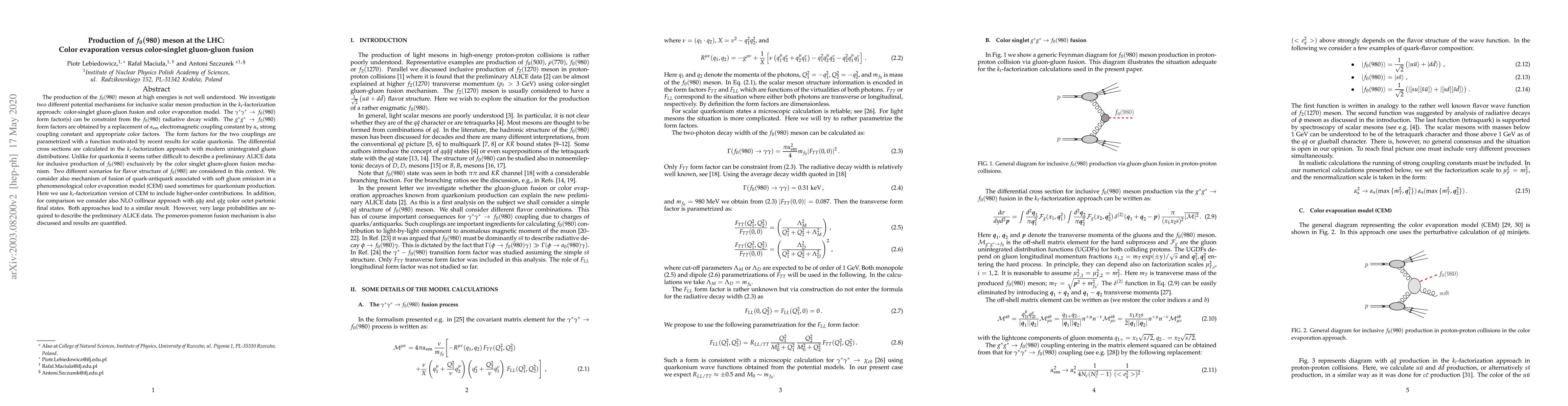 This paper investigates the production mechanisms of the $f_{0}(980)$ meson at the LHC, comparing color-singlet gluon-gluon fusion and color evaporation models within the $k_t$-factorization approach. The study finds that neither mechanism alone can adequately describe preliminary ALICE data, suggesting a complex production process.