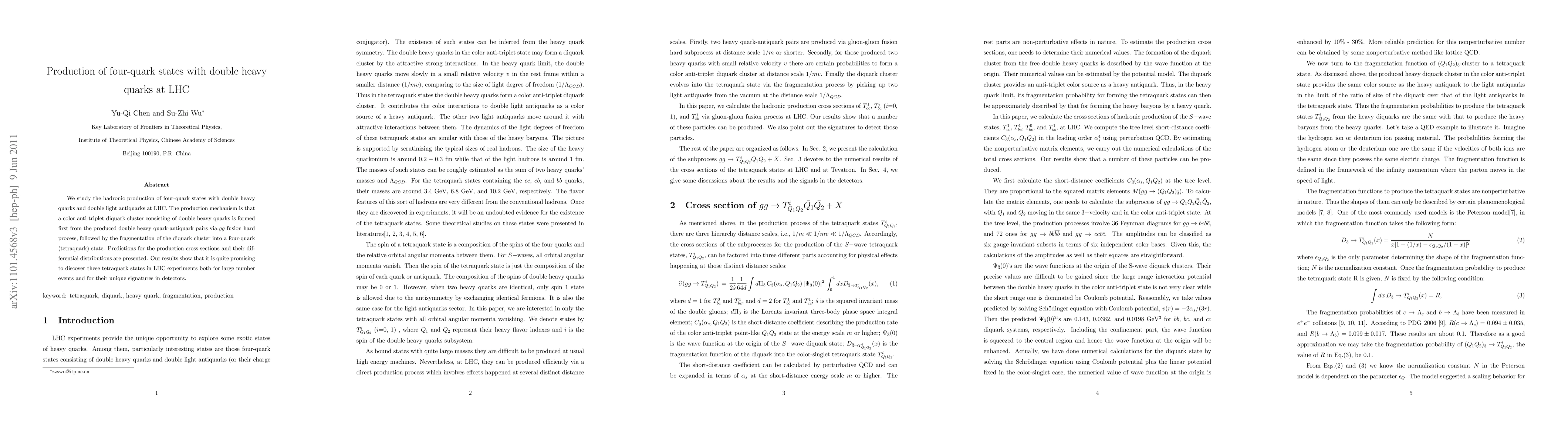 We study the hadronic production of four-quark states with double heavy quarks and double light antiquarks at LHC. The production mechanism is that a color anti-triplet diquark cluster consisting of double heavy quarks is formed first from the produced double heavy quark-antiquark pairs via $gg$ fusion hard process, followed by the fragmentation of the diquark cluster into a four-quark (tetraquark) state. Predictions for the production cross sections and their differential distributions are presented. Our results show that it is quite promising to discover these tetraquark states in LHC experiments both for large number events and for their unique signatures in detectors.