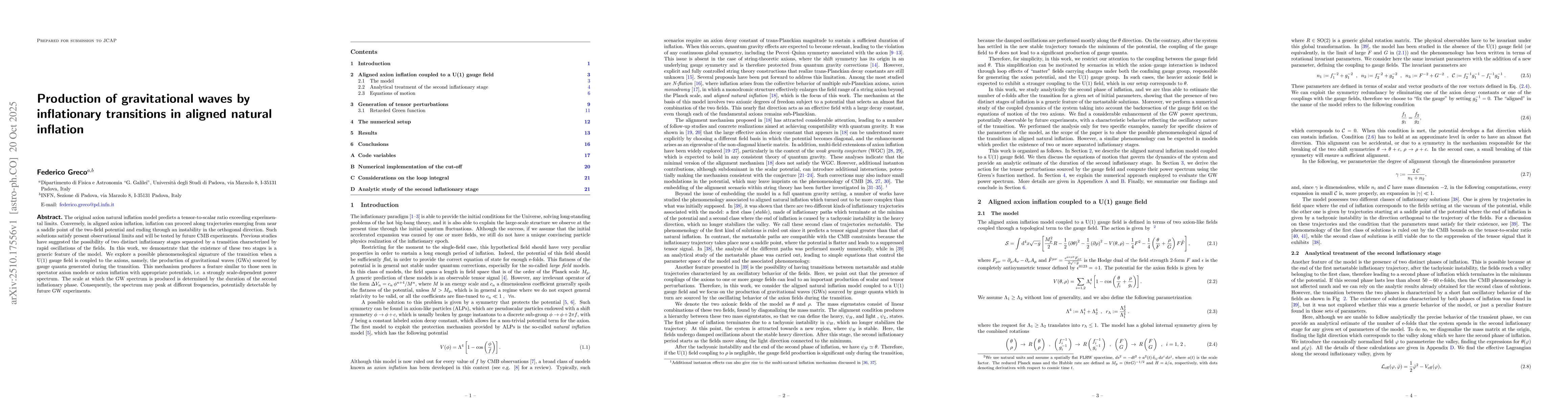 The original axion natural inflation model predicts a tensor-to-scalar ratio exceeding experimental limits. Conversely, in aligned axion inflation, inflation can proceed along trajectories emerging from near a saddle point of the two-field potential and ending through an instability in the orthogonal direction. Such solutions satisfy present observational limits and will be tested by future CMB experiments. Previous studies have suggested the possibility of two distinct inflationary stages separated by a transition characterized by rapid oscillations of the fields. In this work, we demonstrate that the existence of these two stages is a generic feature of the model. We explore a possible phenomenological signature of the transition when a U(1) gauge field is coupled to the axions, namely, the production of gravitational waves (GWs) sourced by gauge quanta generated during the transition. This mechanism produces a feature similar to those seen in spectator axion models or axion inflation with appropriate potentials, i.e. a strongly scale-dependent power spectrum. The scale at which the GW spectrum is produced is determined by the duration of the second inflationary phase. Consequently, the spectrum may peak at different frequencies, potentially detectable by future GW experiments.