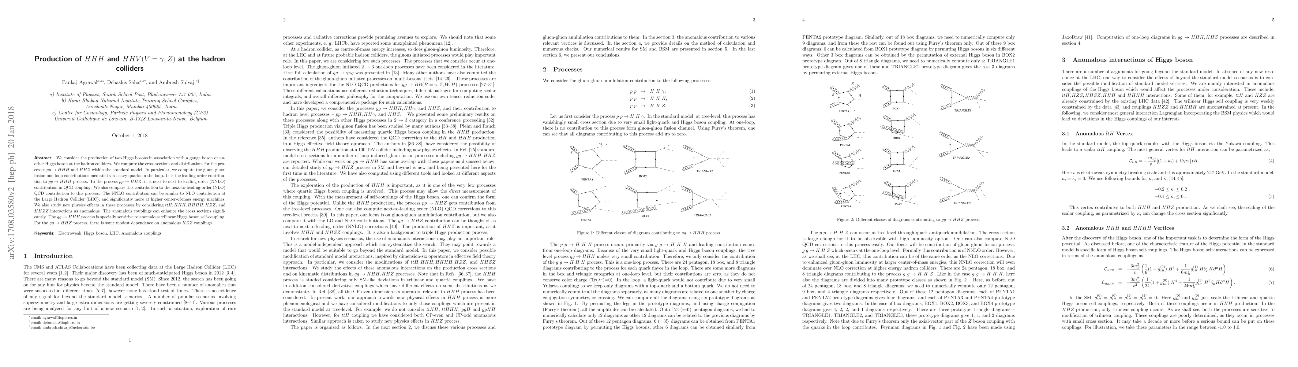 We consider the production of two Higgs bosons in association with a gauge boson or another Higgs boson at the hadron colliders. We compute the cross sections and distributions for the processes $ p p \to H H H $ and $H H Z$ within the standard model. In particular, we compute the gluon-gluon fusion one-loop contributions mediated via heavy quarks in the loop. It is the leading order contribution to $ p p \to H H H $ process. To the process $ p p \to H H Z $, it is next-to-next-to-leading-order (NNLO) contribution in QCD coupling. We also compare this contribution to the next-to-leading-order (NLO) QCD contribution to this process. The NNLO contribution can be similar to NLO contribution at the Large Hadron Collider (LHC), and significantly more at higher center-of-mass energy machines. We also study new physics effects in these processes by considering $ttH, HHH, HHHH, HZZ$, and $HHZZ$ interactions as anomalous. The anomalous couplings can enhance the cross sections significantly. The $gg \to HHH$ process is specially sensitive to anomalous trilinear Higgs boson self-coupling. For the $gg \to HHZ$ process, there is some modest dependence on anomalous $HZZ$ couplings.