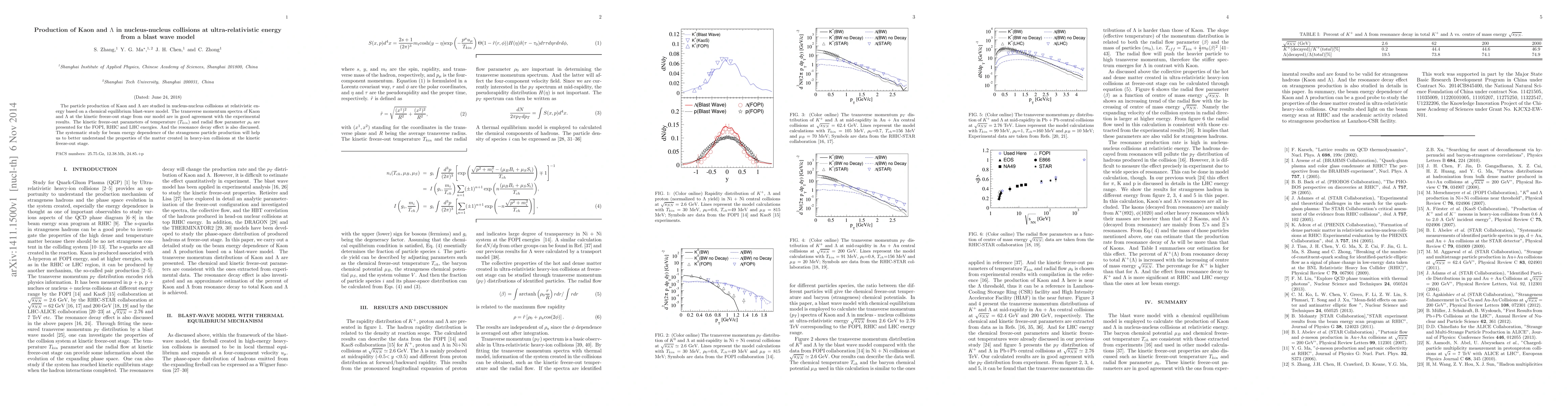 This paper investigates the production of Kaon and $\Lambda$ particles in relativistic nucleus-nucleus collisions using a chemical equilibrium blast-wave model, showing good agreement with experimental data. It presents kinetic freeze-out parameters and discusses the resonance decay effect, aiming to enhance the understanding of matter properties in heavy-ion collisions.