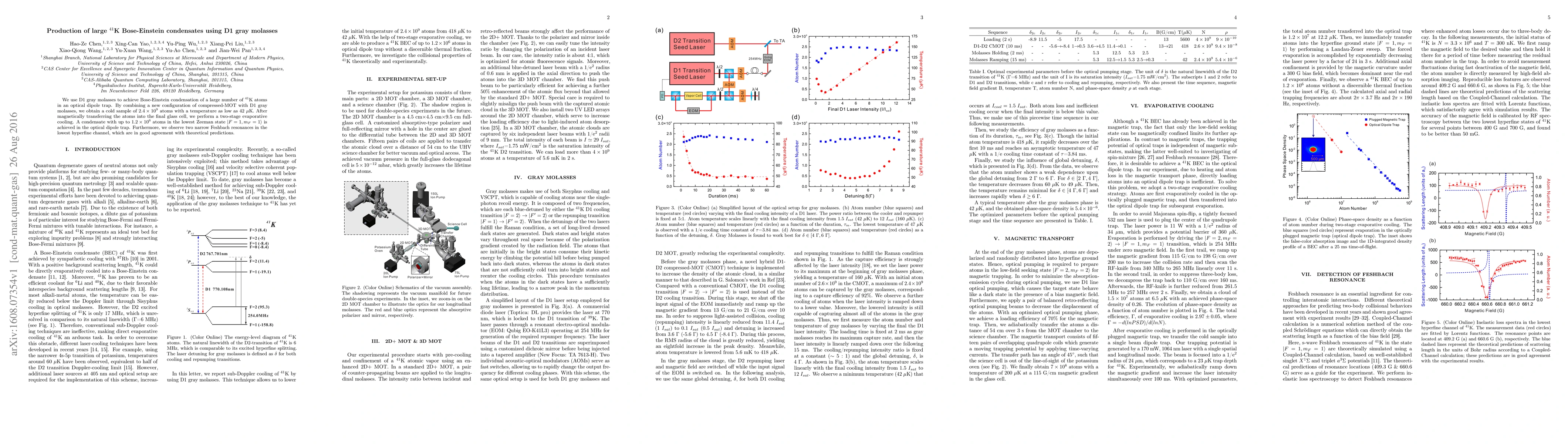 This paper reports the production of large $^{41}$K Bose-Einstein condensates using D1 gray molasses and a compressed-MOT configuration, achieving a cold sample of $2.4\times10^9$ atoms at 42 $\mu$K. A final condensate of $1.2\times10^6$ atoms is obtained in an optical dipole trap, with observed Feshbach resonances matching theoretical predictions.