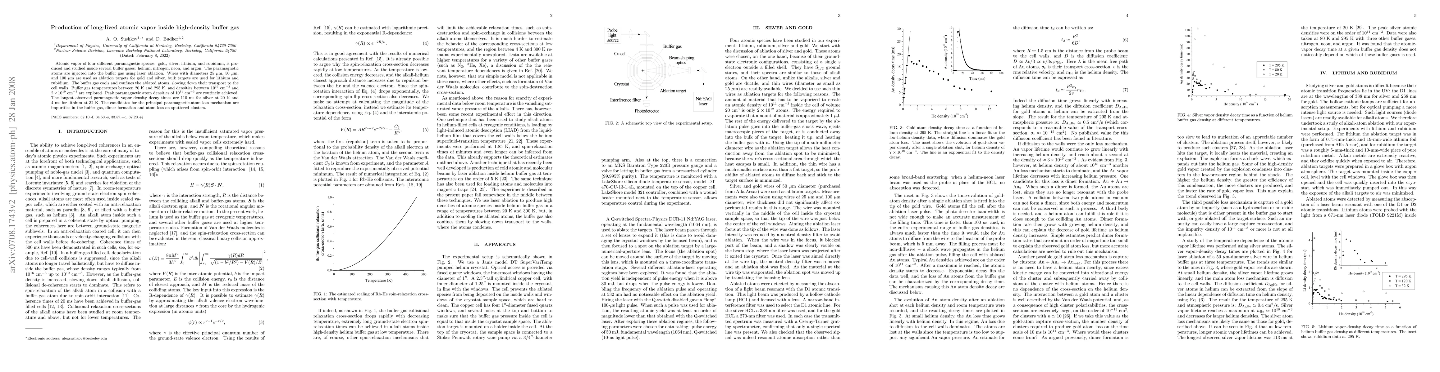 Atomic vapor of four different paramagnetic species: gold, silver, lithium, and rubidium, is produced and studied inside several buffer gases: helium, nitrogen, neon, and argon. The paramagnetic atoms are injected into the buffer gas using laser ablation. Wires with diameters 25 $\mu$m, 50 $\mu$m, and 100 $\mu$m are used as ablation targets for gold and silver, bulk targets are used for lithium and rubidium. The buffer gas cools and confines the ablated atoms, slowing down their transport to the cell walls. Buffer gas temperatures between 20 K and 295 K, and densities between $10^{16}$ cm$^{-3}$ and $2\times10^{19}$ cm$^{-3}$ are explored. Peak paramagnetic atom densities of $10^{11}$ cm$^{-3}$ are routinely achieved. The longest observed paramagnetic vapor density decay times are 110 ms for silver at 20 K and 4 ms for lithium at 32 K. The candidates for the principal paramagnetic-atom loss mechanism are impurities in the buffer gas, dimer formation and atom loss on sputtered clusters.