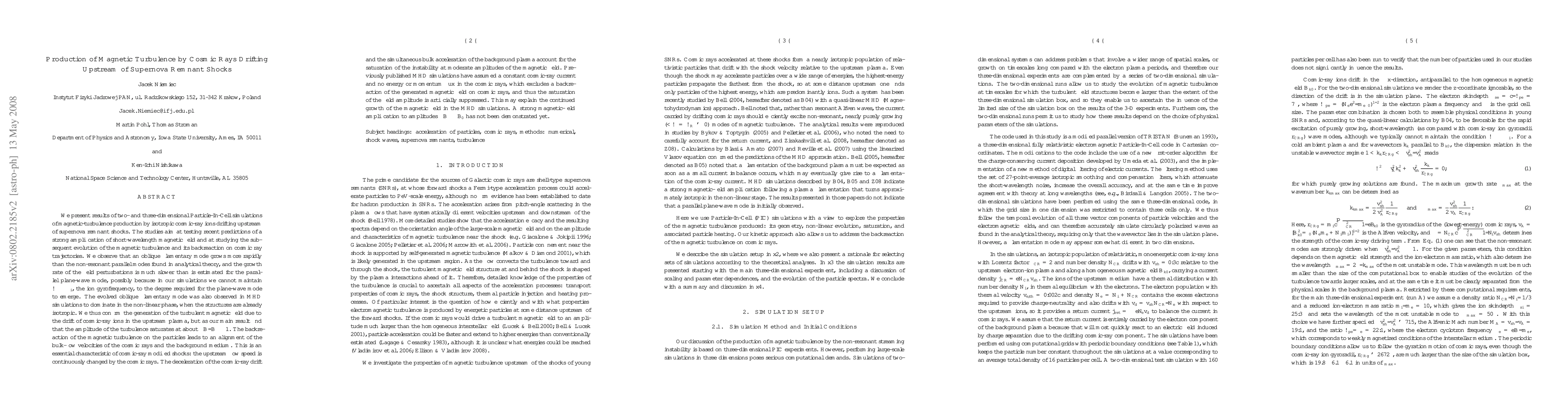 This paper uses 2D and 3D PIC simulations to study magnetic turbulence generated by cosmic rays upstream of supernova remnant shocks, finding that an oblique filamentary mode dominates over parallel modes. The turbulence saturates at dB/B~1 due to backreaction on cosmic rays, contrasting with MHD simulations that show continued field growth.