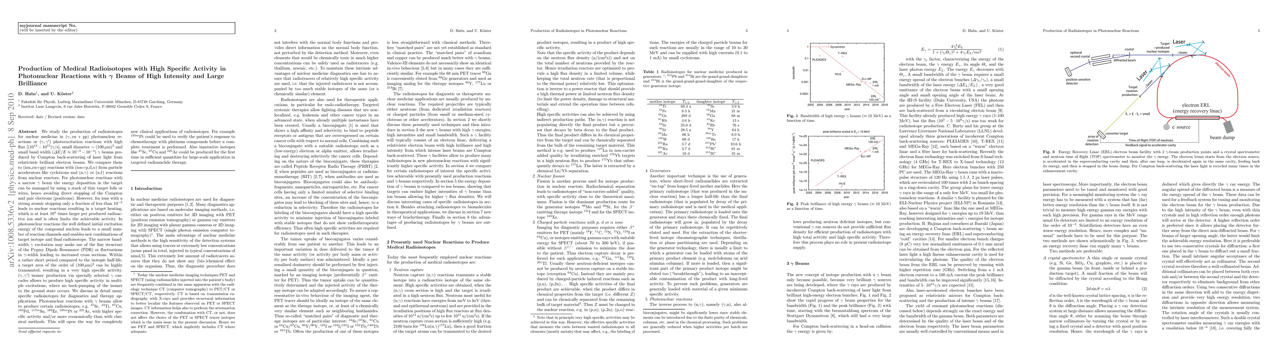 We study the production of radioisotopes for nuclear medicine in $(\gamma,x{\rm n}+y{\rm p})$ photonuclear reactions or ($\gamma,\gamma'$) photoexcitation reactions with high flux [($10^{13}-10^{15}$)$\gamma$/s], small diameter $\sim (100 \, \mu$m$)^2$ and small band width ($\Delta E/E \approx 10^{-3}-10^{-4}$) $\gamma$ beams produced by Compton back-scattering of laser light from relativistic brilliant electron beams. We compare them to (ion,$x$n$ + y$p) reactions with (ion=p,d,$\alpha$) from particle accelerators like cyclotrons and (n,$\gamma$) or (n,f) reactions from nuclear reactors. For photonuclear reactions with a narrow $\gamma$ beam the energy deposition in the target can be managed by using a stack of thin target foils or wires, hence avoiding direct stopping of the Compton and pair electrons (positrons). $(\gamma,\gamma')$ isomer production via specially selected $\gamma$ cascades allows to produce high specific activity in multiple excitations, where no back-pumping of the isomer to the ground state occurs. We discuss in detail many specific radioisotopes for diagnostics and therapy applications. Photonuclear reactions with $\gamma$ beams allow to produce certain radioisotopes, e.g. $^{47}$Sc, $^{44}$Ti, $^{67}$Cu, $^{103}$Pd, $^{117m}$Sn, $^{169}$Er, $^{195m}$Pt or $^{225}$Ac, with higher specific activity and/or more economically than with classical methods. This will open the way for completely new clinical applications of radioisotopes. For example $^{195m}$Pt could be used to verify the patient's response to chemotherapy with platinum compounds before a complete treatment is performed. Also innovative isotopes like $^{47}$Sc, $^{67}$Cu and $^{225}$Ac could be produced for the first time in sufficient quantities for large-scale application in targeted radionuclide therapy.