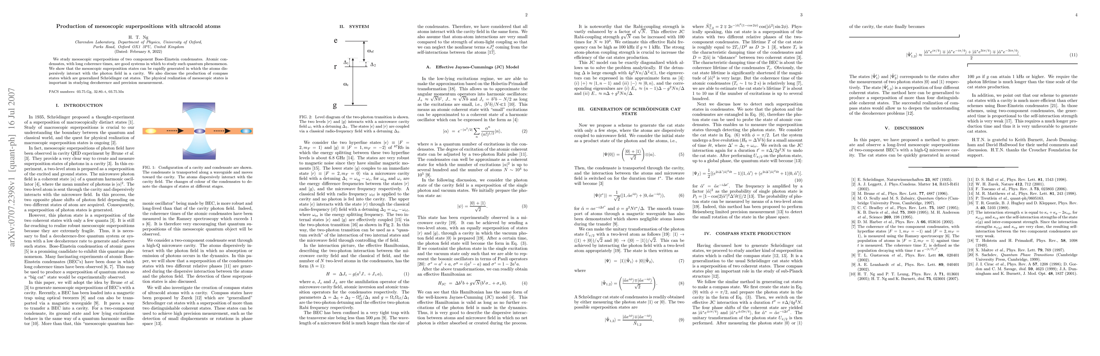 This paper investigates the generation of mesoscopic superposition states in two-component Bose-Einstein condensates using long-coherence-time ultracold atoms. It demonstrates the rapid creation of these states and their interaction with photons in a cavity, alongside the production of compass states, which are generalized Schrödinger cat states, highlighting the significance of such states in studying decoherence and precision measurement.